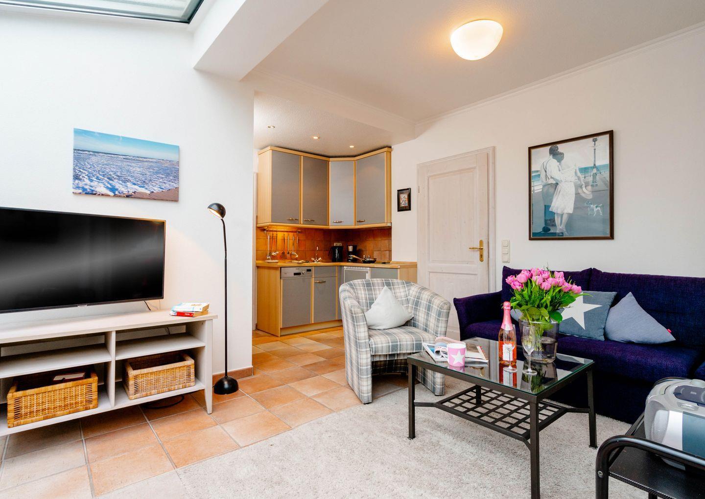 Moin, willkommen auf der Insel, heuern Sie doch mal bei unserem „Bootsmann“ an?! Die gleichnamige ebenerdige Westerländer 2-Zimmer-Ferienwohnung besticht mit viel Licht durch ihren attraktiven Wintergarten und durch ihre Lage in einer ruhigen Seitenstraße. Von hier aus sind es nur fünf Minuten zum Strandübergang „Friesische“, wie ihn die Einheimischen verknappt nennen. Auch die lebendige Innenstadt mit allen Shoppingmöglichkeiten und den großen Supermärkten ist von hier aus entspannt zu Fuß zu erreichen. Dieses Ferienappartement ist ungefähr 40 Quadratmeter groß und perfekt für zwei Personen, hat sogar eine Terrassen, eine friesisch blaue Wohnküche, sehr schönen Plavoizen-Boden und ein Schlafzimmer mit Doppelbett.