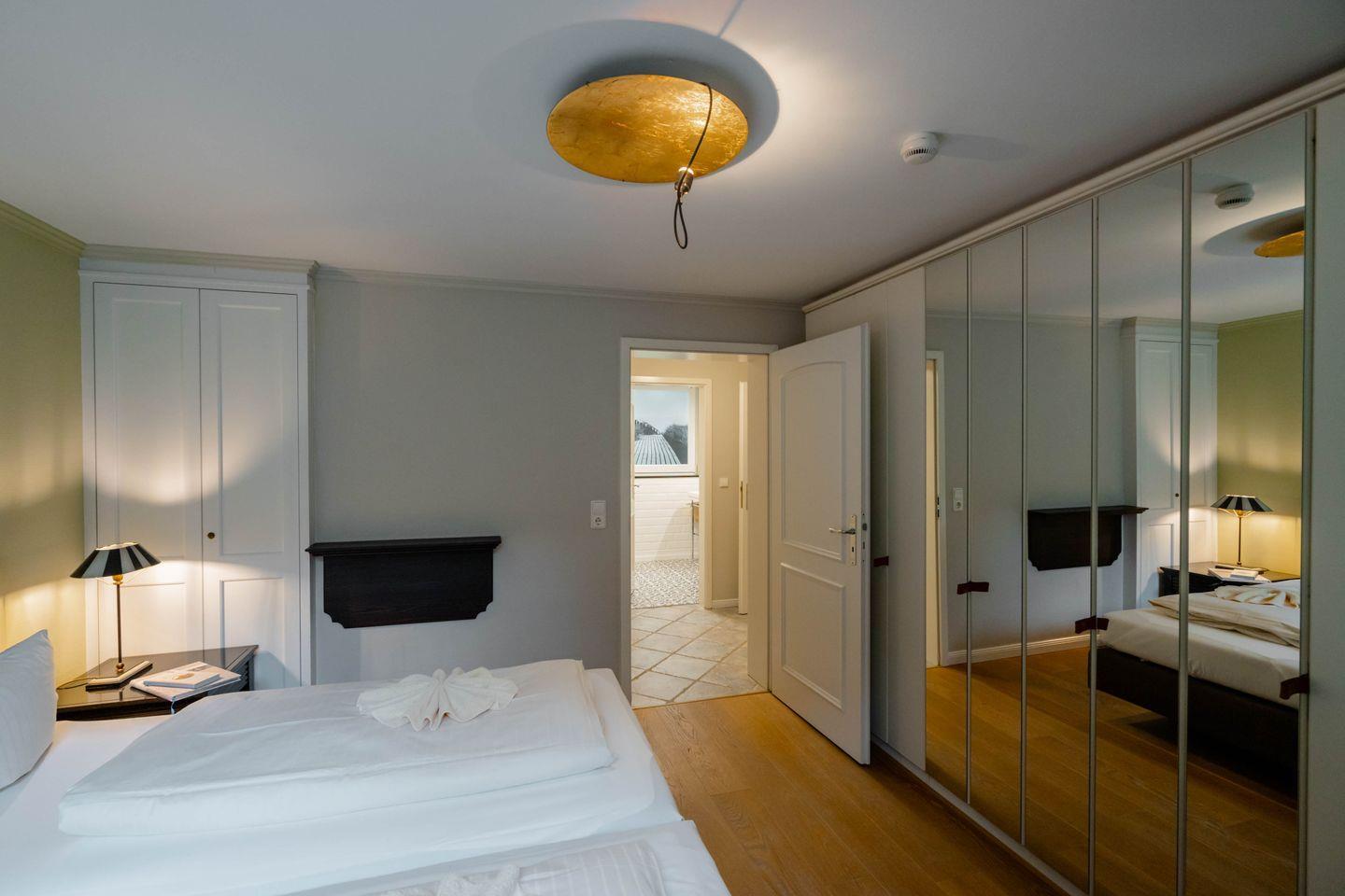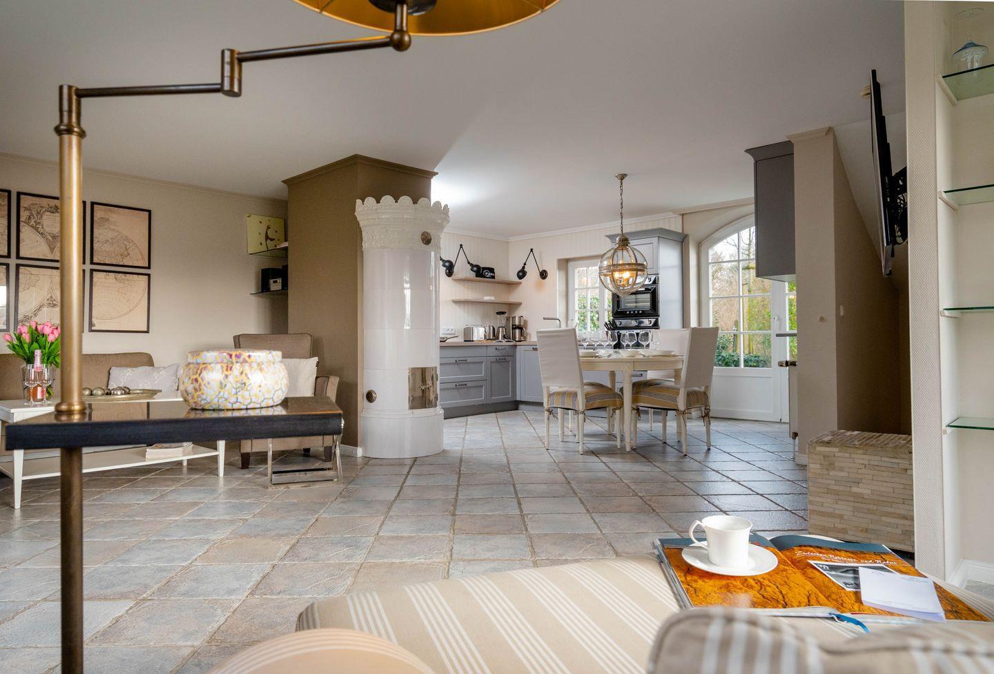 Moin, moin, willkommen in „Ekke 2“ wie wir diese Ferienwohnung kurz und knapp nennen. Sie verdankt ihren Namen dem Inselkobold „Ekke Nekkepenn“, einer Art nordfriesischem Rumpelstilzchen, das in Sylter Sagen herumpoltert. „Ekke 2“, gelegen in einem sylttypischen Doppelhaus, passt also sagenhaft perfekt mit ganzen fünf Räumen für bis zu vier Erwachsene. Star des großzügigen Wohn-Essbereichs mit offener Landhausküche ganz in Weiß ist sicherlich der wunderschöne und über 100 Jahre alte „Mylin“-Kachelofen. Die luxuriöse Ferienwohnung erstreckt sich über ein Erd- und ein Warftgeschoss, was für erholsamen und ungestörten Schlaf sorgt, nicht zuletzt auch wegen der hochwertigen Boxspringdoppelbetten in den zwei Schlafzimmern mit attraktiven Eichendielen und durchdachten Einbauten.