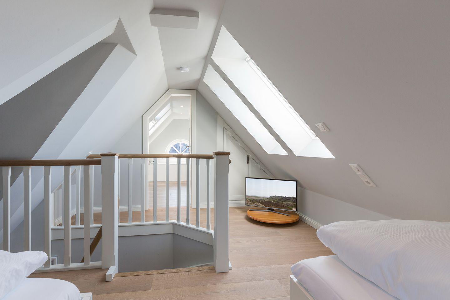 Im Dachgeschossbereich Ihres "Wohnen und Mee(h)r" geht es äußerst kuschelig zu - perfekt für Ihre Kinder. Auf zwei Einzelbetten lässt es sich herrlich chillen. Das große En-Suite Wannenbad ist ein herrlicher Ort zum Relaxen und Genießen.