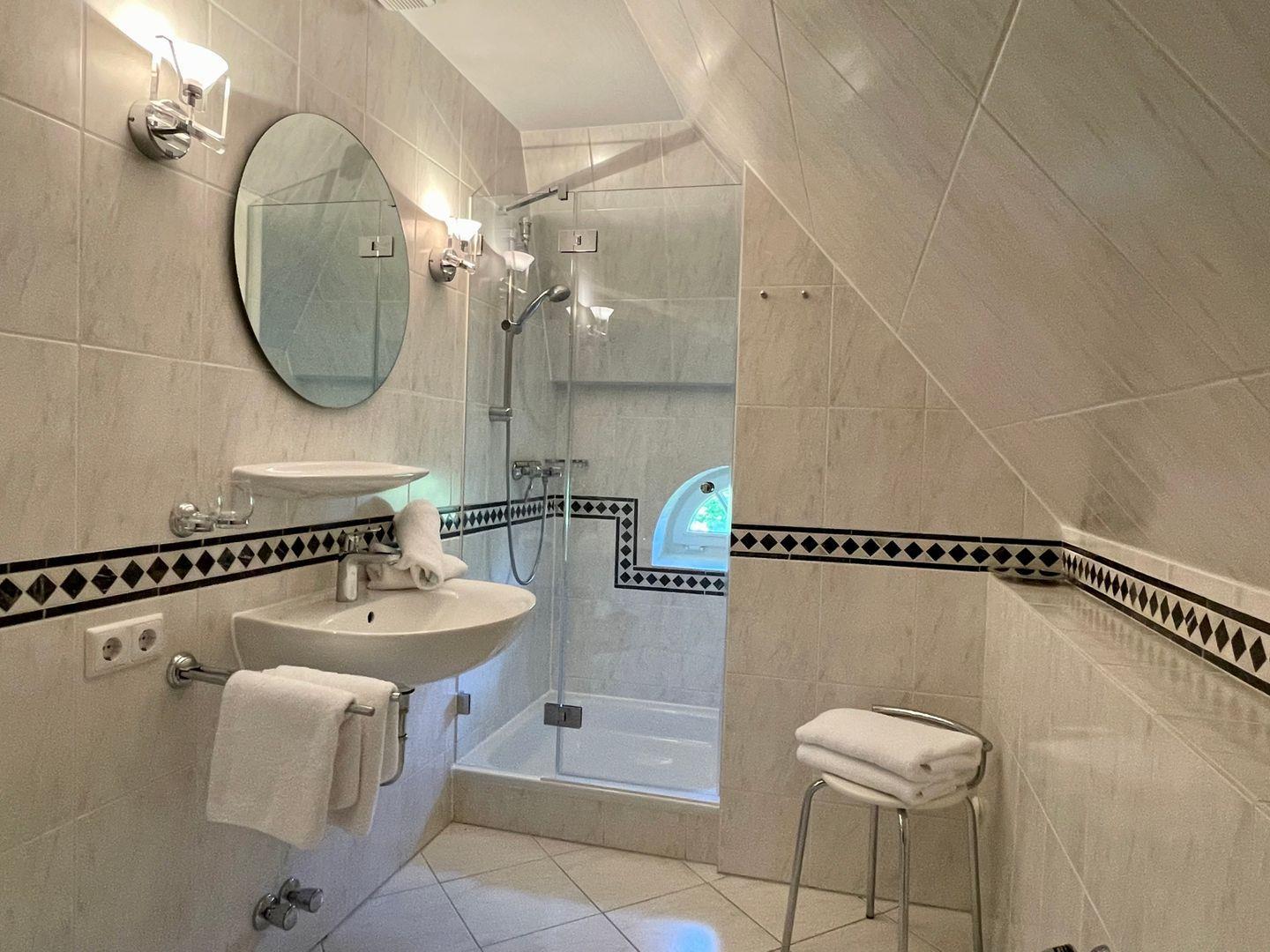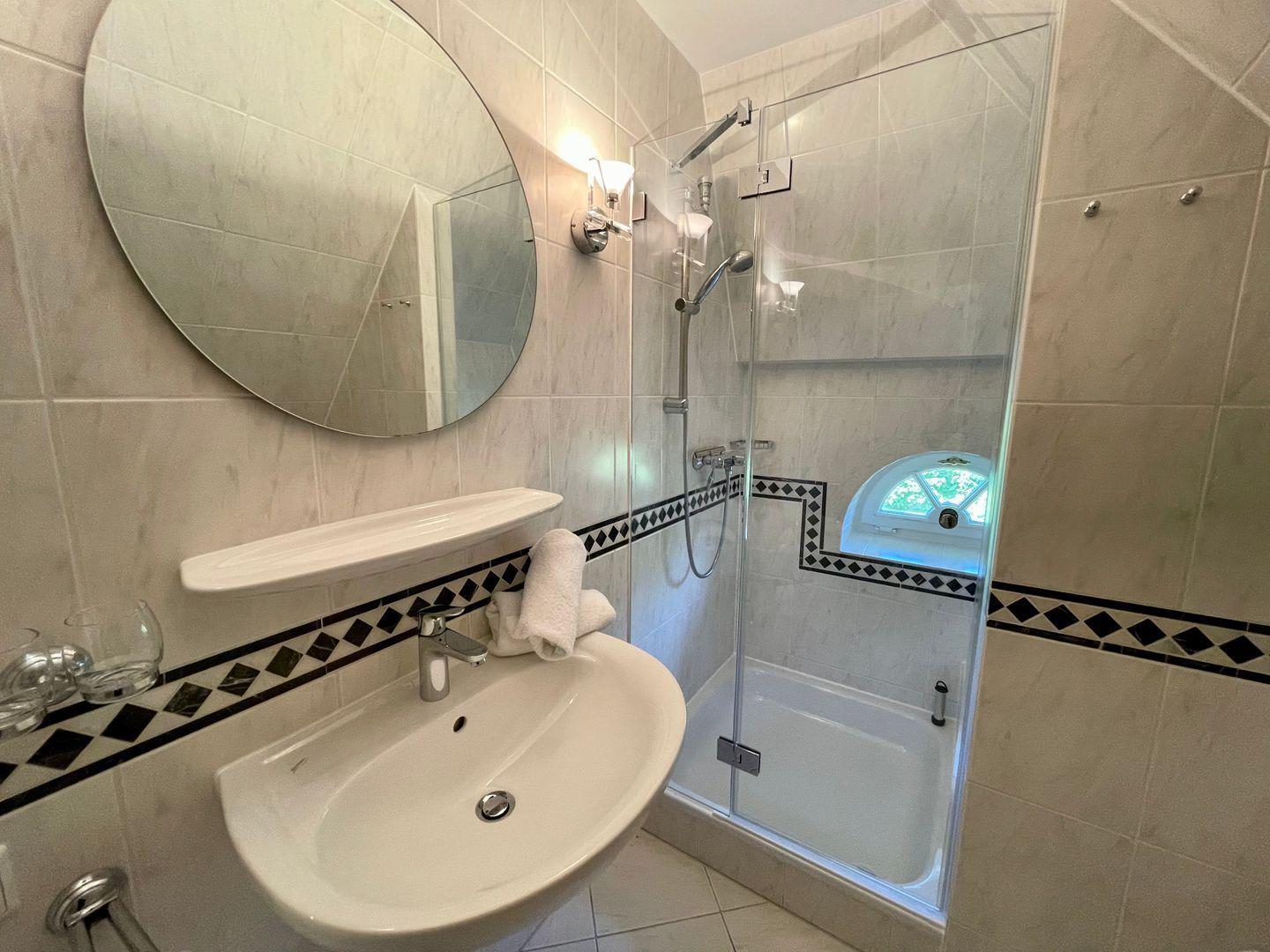 Direkt neben dem Schlafraum befindet sich das helle Tageslichtbad mit Dusche. Die Glasabtrennung und der niedrige Einstieg sorgen auch hier für Komfort. Ablageflächen. Waschbecken und WC komplettieren das Badezimmer. Ergänzend verfügt die Wohnung 1. "Enna" über ein kleines Gästebad.