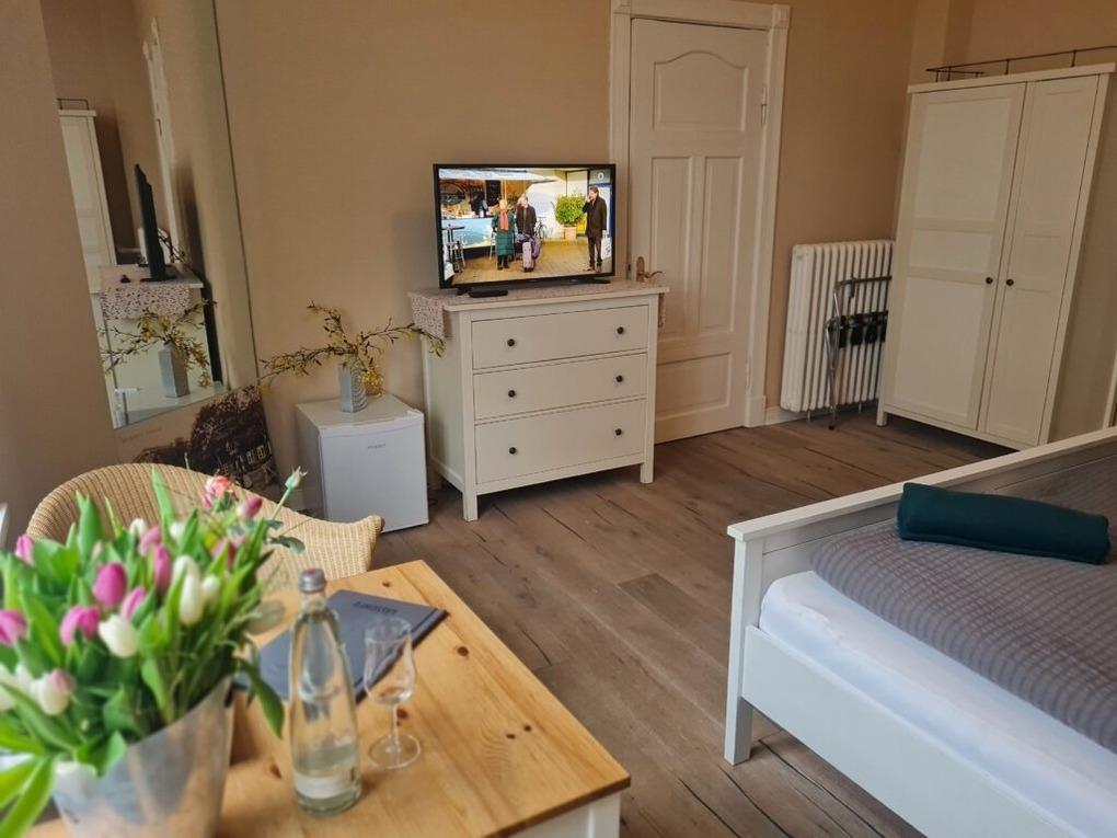 Das Zimmer befindet sich im 1. Obergeschoss mit Ausblick auf die Friedrichstraße. Holzboden, helle Möbel und nicht zuletzt der besondere Charme des Hauses gehören zu den Räumlichkeiten.