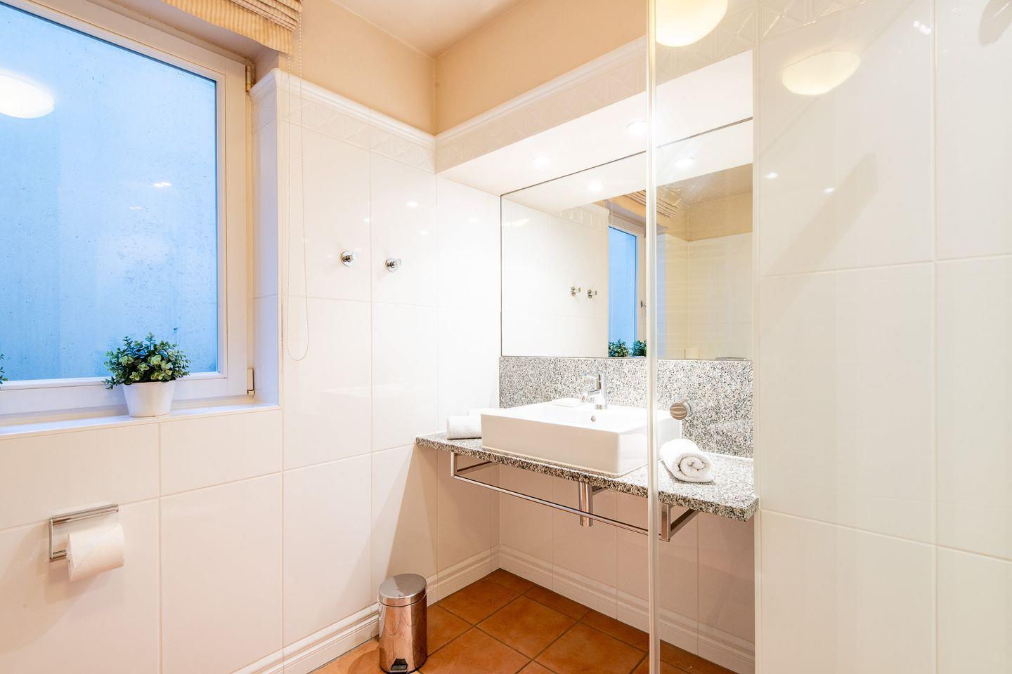 Das Badezimmer im unteren Bereich ist modern und funktional gestaltet. Die bodentiefe Dusche sorgt für eine komfortable Nutzung und trägt zur entspannten Atmosphäre bei.