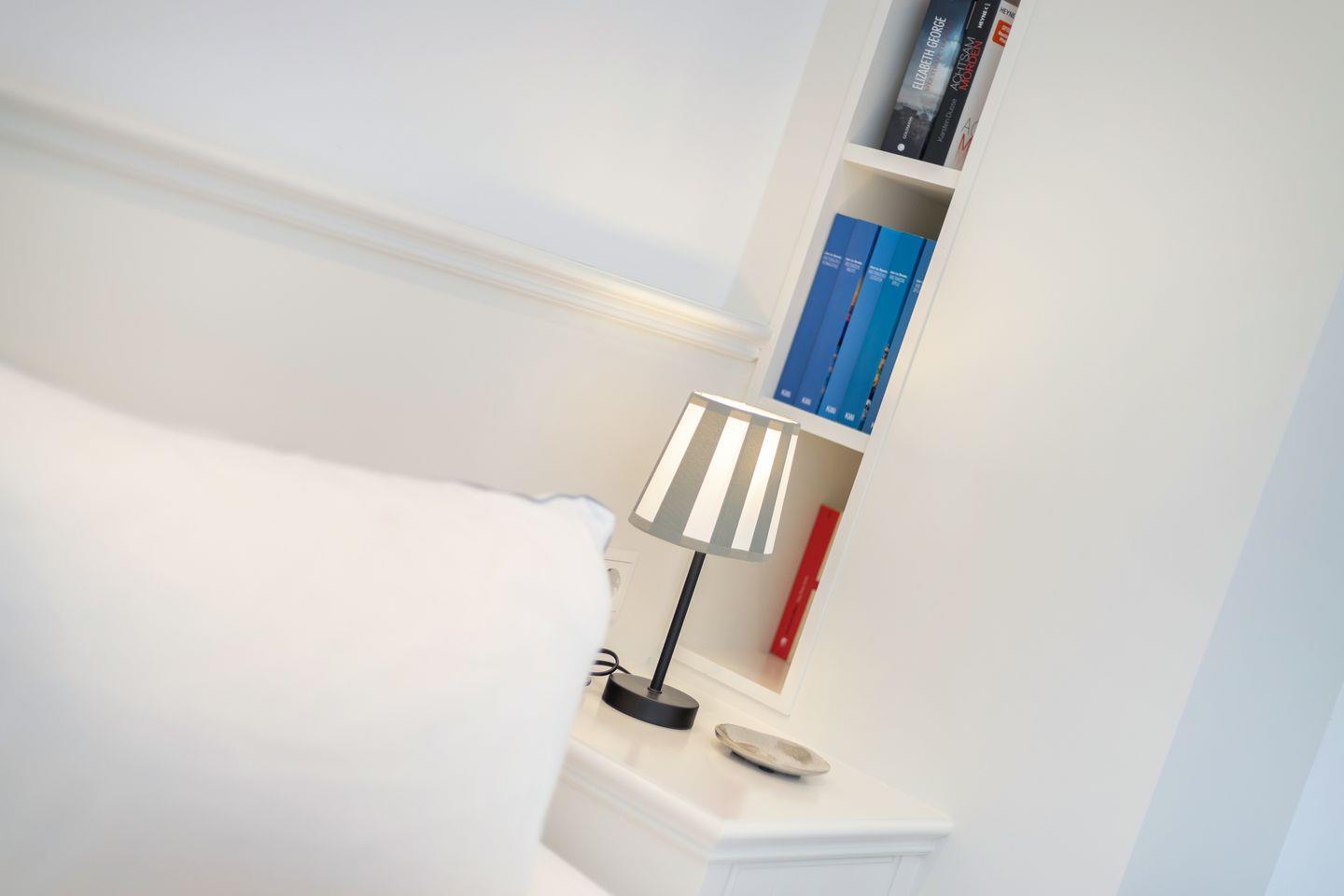 Das OG verfügt über zwei Schlafräume mit Doppelbett (1,80m & 1,60m breit). Ein Schlafzimmer ist mit einem weiteren Flach-TV ausgestattet. Darüber hinaus ist ein hochwertiges Bad mit Dusche & WC zu finden (Travertin/Naturstein & Badelemente von KEUCO).