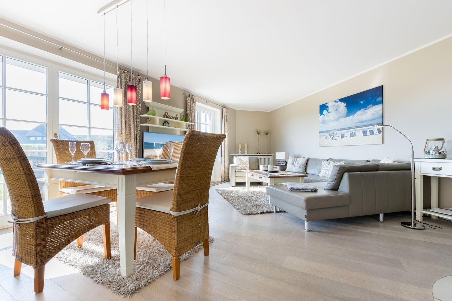 Willkommen in der Strandresidenz, Wohnung Föhr, Ihrem perfekten Rückzugsort auf Sylt! Diese 105 m² Nutzfläche große Ferienwohnung mit zwei Schlafzimmern bietet Ihnen Komfort und Stil. Genießen Sie den offenen Wohnbereich mit voll ausgestatteter Küche, moderne Unterhaltungstechnik und eine gemütliche Sofaecke. Die Terrasse mit Gartenmöbeln lädt zum Entspannen ein, während der Strand nur 100 Meter entfernt ist. Buchen Sie jetzt Ihren Traumurlaub!