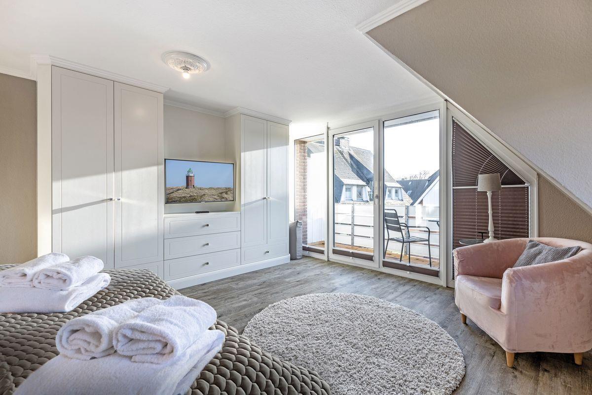 Im Erdgeschoss erwartet Sie das Wohnzimmer mit seiner großen Sitzecke und daran an grenzt die durch einen kleinen Tresen abgetrennte Küche, in welcher auch eine Nespresso-Maschine auf Sie wartet. Das separate Esszimmer bietet Platz genug für eine Großfamilie und ist wie auch das Wohnzimmer mit einem TV ausgestattet. Bei schönem Wetter lädt auch die Süd-Terrasse mit Gartenmöbeln und Strandkorb zum draußen sitzen ein. Genießen Sie schon zum Frühstück die Sonne auf der Terrasse.