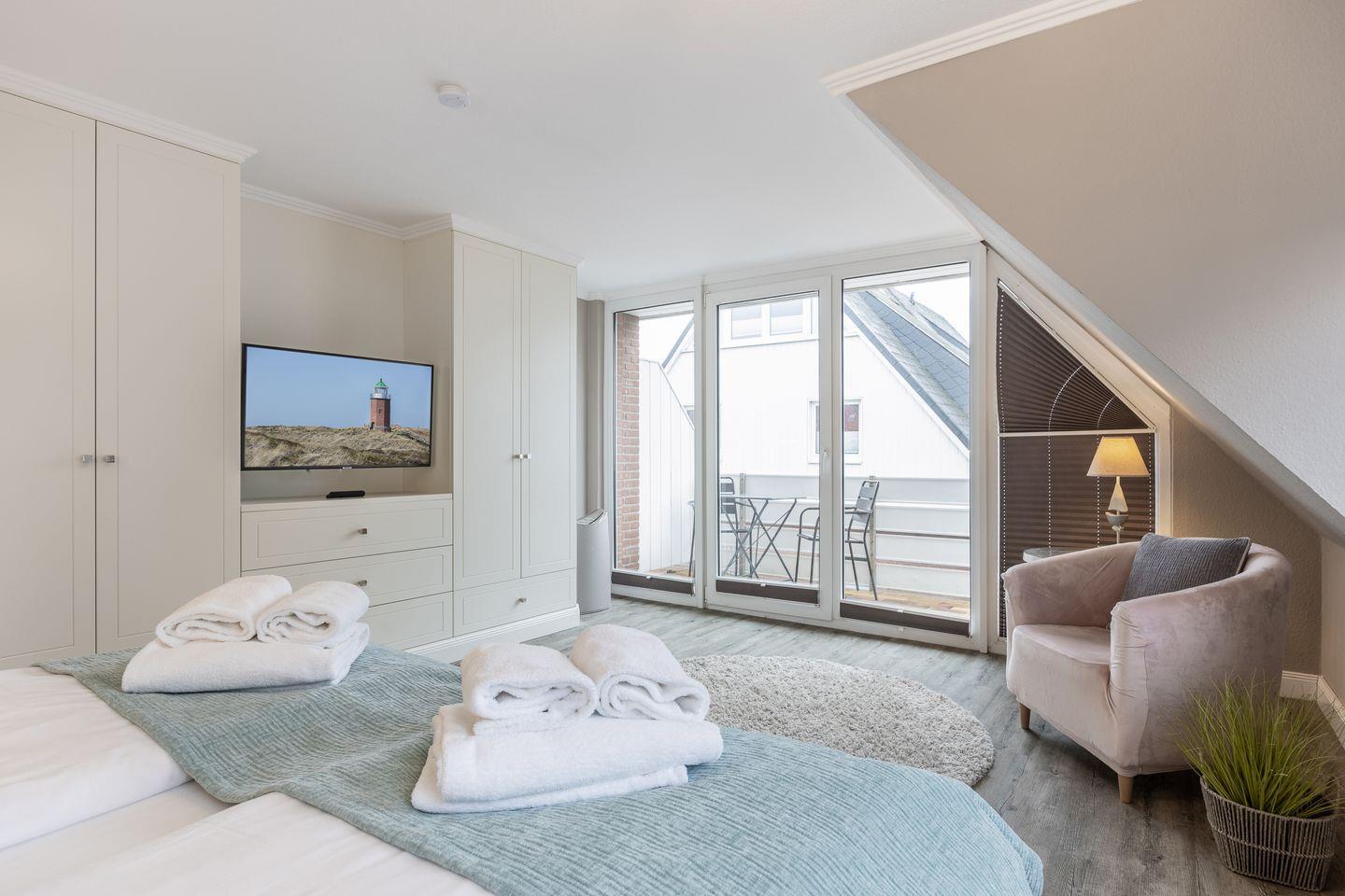Sie auf einem modernen Polsterbett. Eine hochwertige Schlafcouch steht hier zusätzlich zur Verfügung. Ein Flatscreen-TV ist auch hier wie in allen Schlafzimmern vorhanden und im Ober- und Dachgeschoss stehen neue Einbauschränke für Sie bereit.