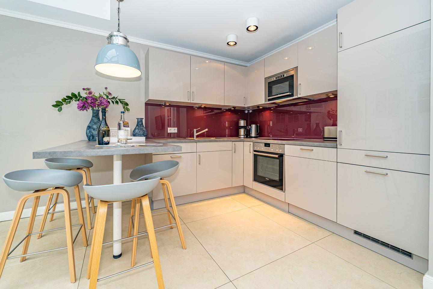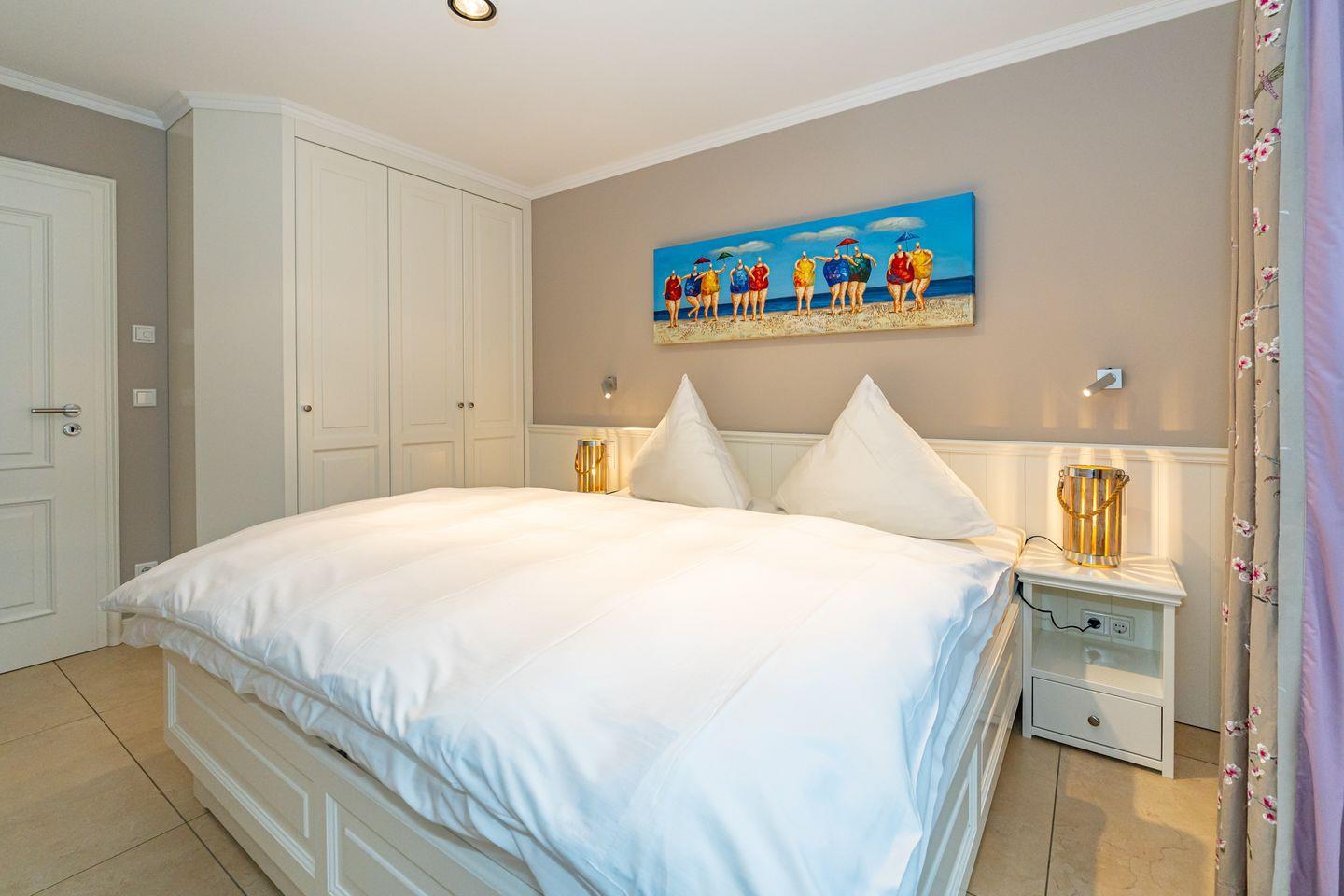 Wenn Sie die Ferienwohnung betreten gelangen Sie durch den Flur direkt in das geschmackvolle Wohnzimmer mit großer, offener und selbstverständlich voll ausgestatteter Küche (Nespresso Kaffeemaschine, Filterkaffeemaschine, Backofen, Kühlschrank, Spülmaschine). Von hier gelangen Sie auf Ihre Terrasse. Hier können Sie an sonnigen Tagen im klassischen Sylter Strandkorb Ihren Urlaub genießen. Für die besonders lichte, naturnahe Atmosphäre dieser Ferienwohnung sorgt das wintergartenähnliche Dachkonstrukt im Wohn- und Esszimmer. Ihr Domizil hat zwei Schlafzimmer, eines mit Doppelbett und direktem Zugang zur Süd-Terrasse, eines mit zwei sehr charmant über Eck eingebauten Einzelbetten. Für den besonderen Komfort sorgen zwei Duschbäder mit bodengleicher Dusche und Handtuchtrockner. Für das Extra-Quäntchen Luxus sorgt der hauseigene, gemeinschaftliche Wellnessbereich mit einer Sauna.