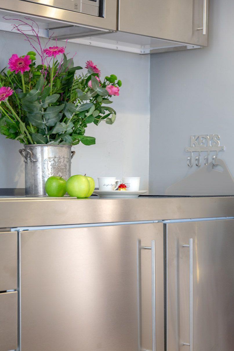 Voll ausgestattet Küche (Mikrowelle, Geschirrspüler, 2 Platten-Cerankochfeld und Nespresso Maschine), kleine Essecke, sowie der Wohn-/ Schlafbereich mit einem Boxspringbett und einem Schlafsofa (jeweils 160 x 200cm). Hier stehen Ihnen also 2 separate Schlafmöglichkeiten zur Verfügung. Diese Wohnung hat einen Balkon in Ostausrichtung mit Morgensonne im Sommer. Die Wohnung erreichen Sie bequem mit einem Fahrstuhl. Im Haus gibt es Abstellmöglichkeiten für Ihre Fahrräder.