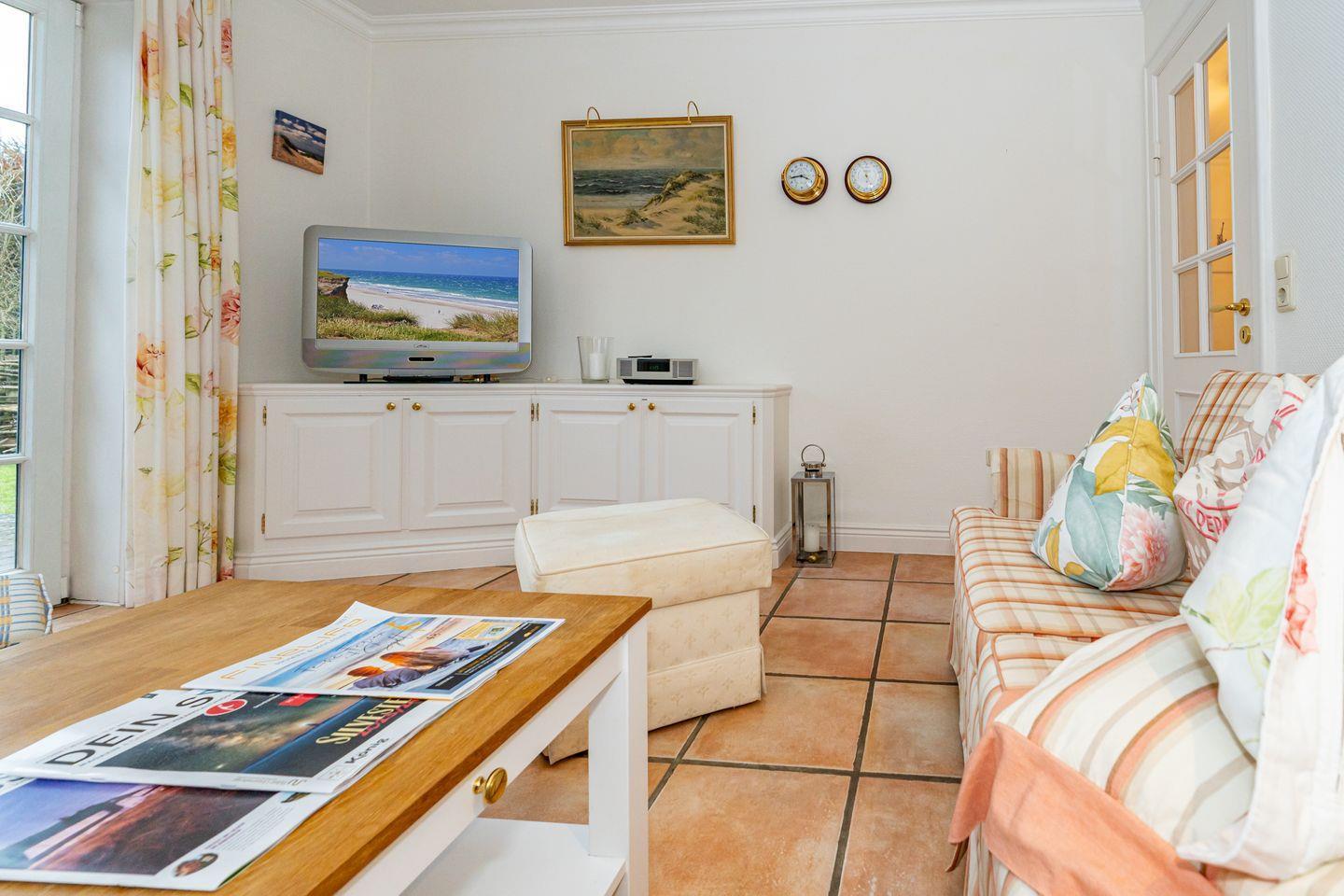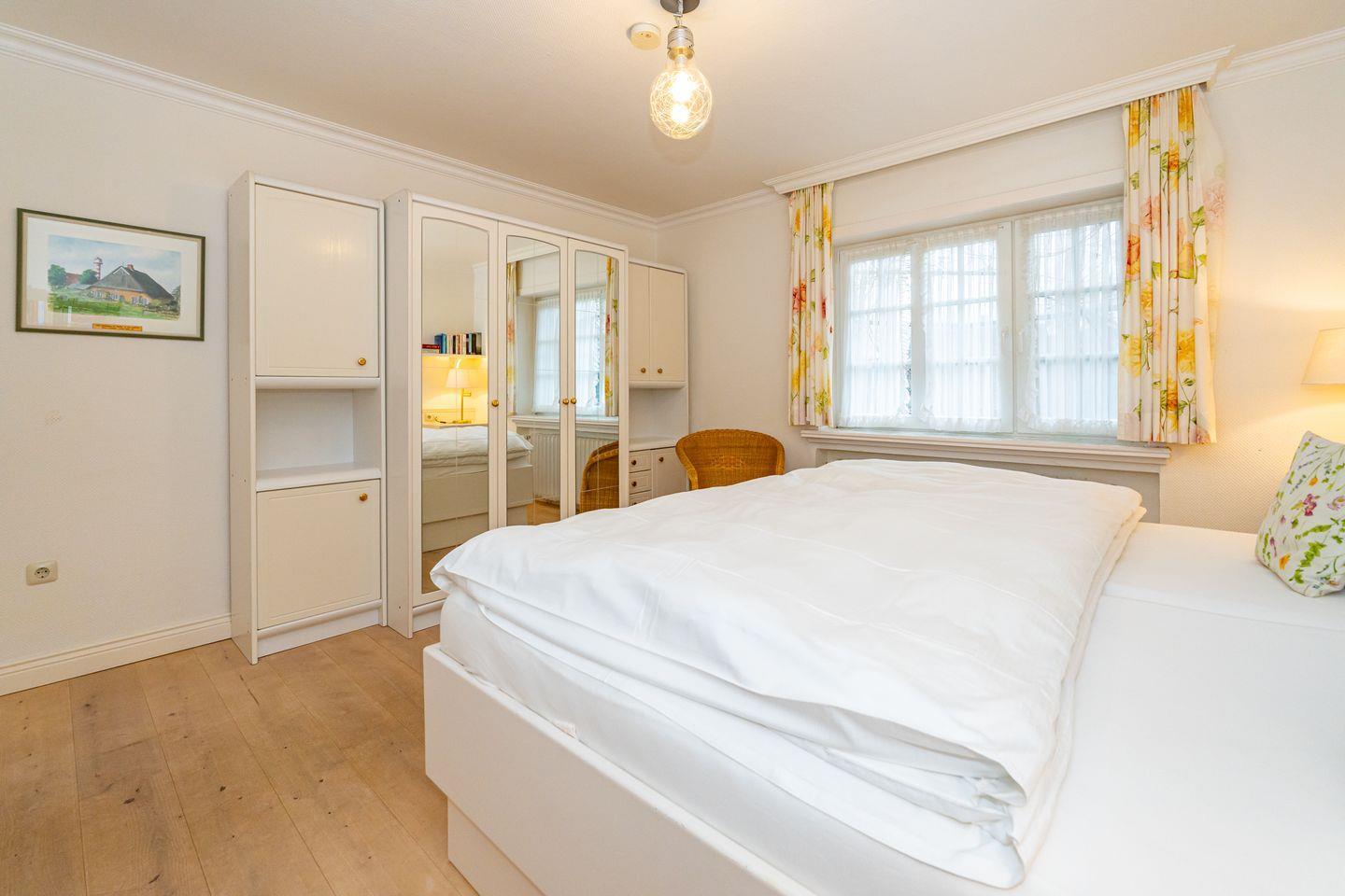 Diese gemütliche 2-Zimmer-Ferienwohnung liegt im Herzen von Keitum. Vom Flur der ebenerdigen Ferienwohnung "Kajüte" haben Sie Zutritt zu allen Räumen. Die Küche verfügt über einen Essplatz, Backofen, Geschirrspüler, Kühlschrank mit Gefrierfach und Nespressokapselmaschine. Im hellen Wohnbereich erwartet Sie ein Sofa und TV. Von hier aus haben Sie Zugang zu Ihre eigenen Terrasse im Gemeinschaftsgarten des 3 Parteien Hauses. Im Schlafzimmer erwartet Sie ein Doppelbett und ein Kleiderschrank. Das Badezimmer ist ausgestattet mit einer bodengleiche Dusche und WC und hat ein Fenster. Ein PKW Stellplatz steht Ihnen am Haus zur Verfügung.