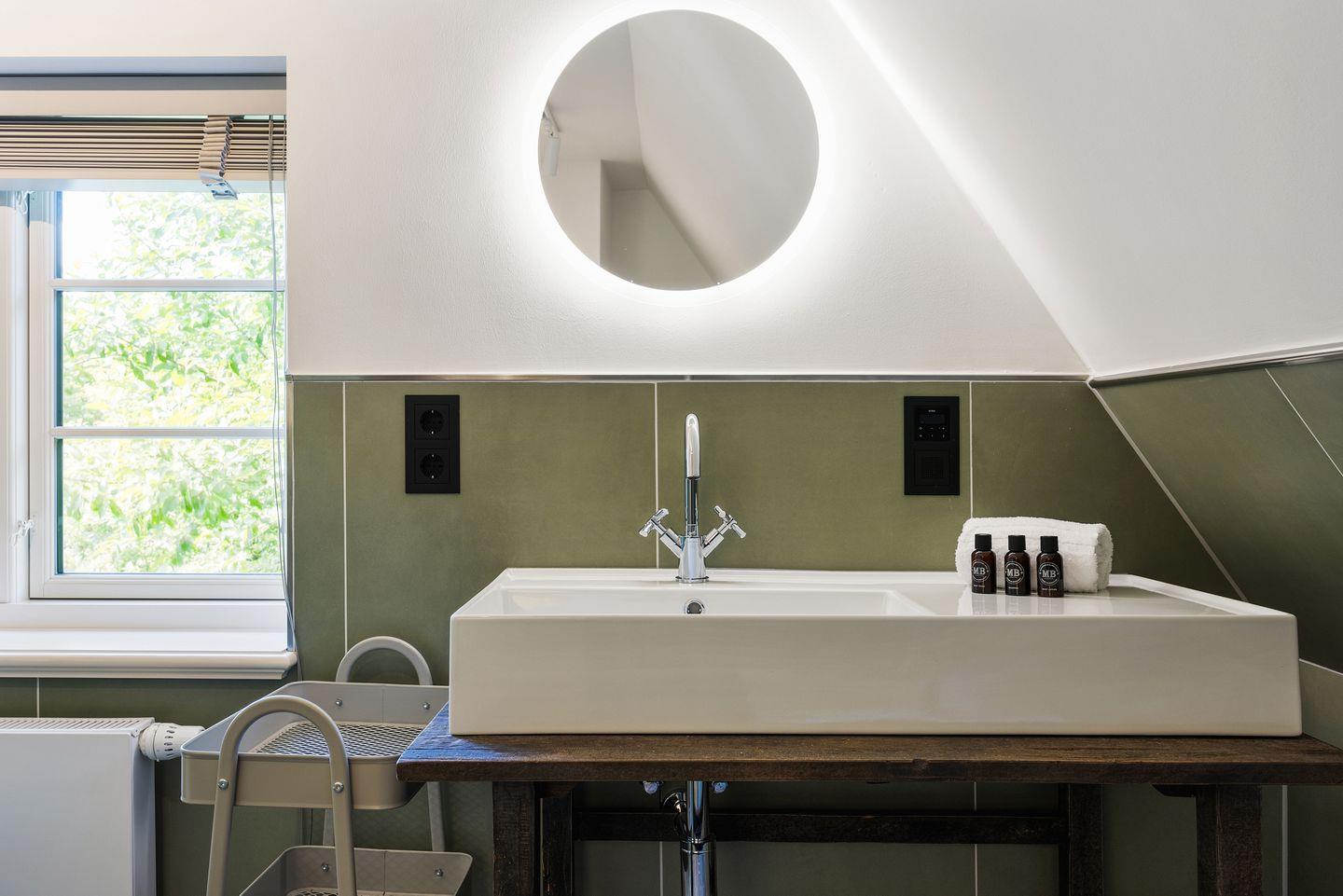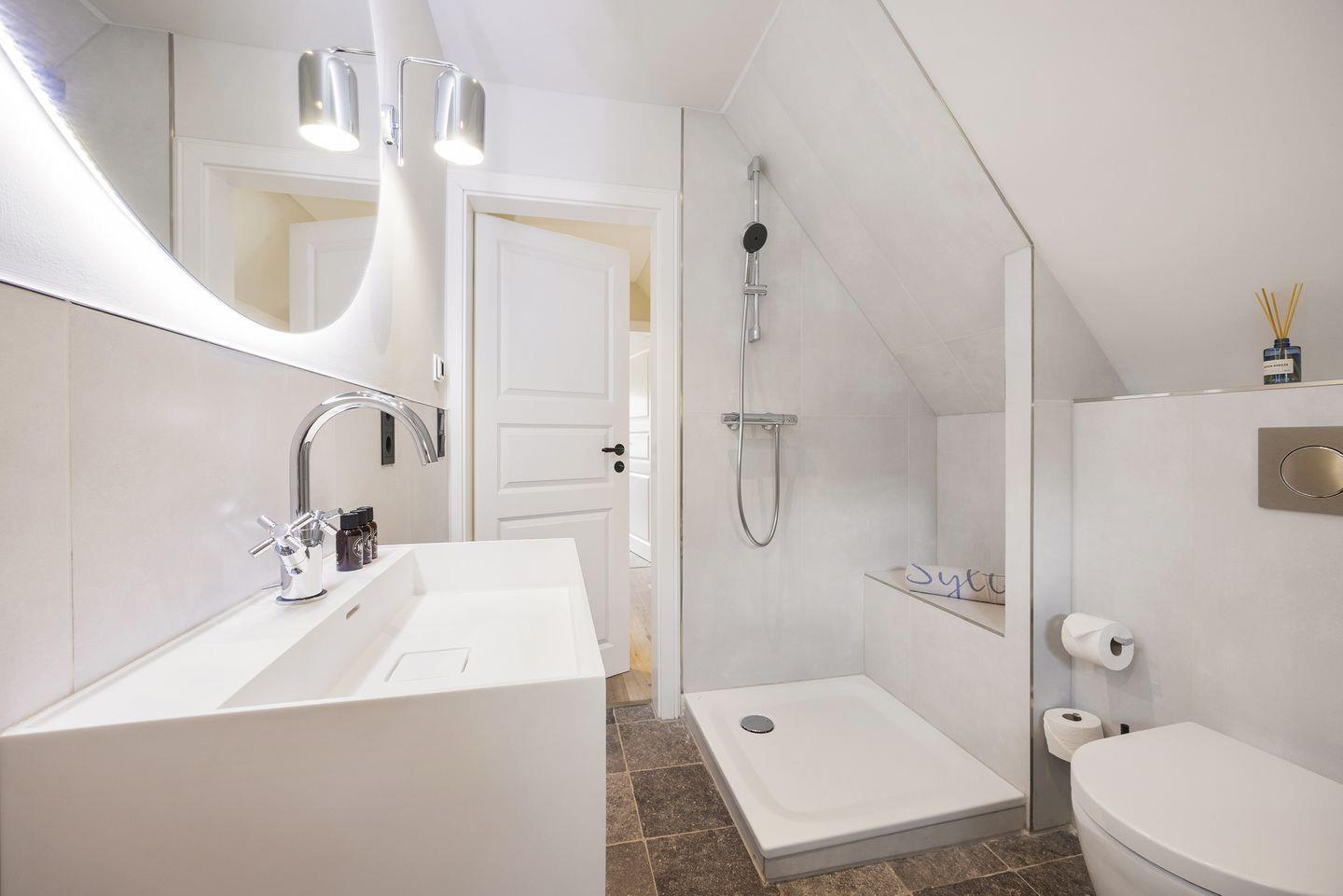 Ein besonderer Luxus dieses Hauses ist die eigene Sauna mit Regendusche, die nach einem erlebnisreichen Tag auf der Insel Erholung pur bietet. Die Unterkunft verfügt insgesamt über drei Badezimmer: Das Hauptbadezimmer im Obergeschoss ist mit einer großzügigen Badewanne und Dusche ausgestattet und bietet Tageslicht, einen Handtuchwärmer und einen Föhn. Ein weiteres Duschbad befindet sich im Erdgeschoss, und ein zusätzliches Vollbad mit Badewanne im Obergeschoss sorgt für hohen Komfort. Für Gäste steht im Erdgeschoss ein separates WC zur Verfügung.