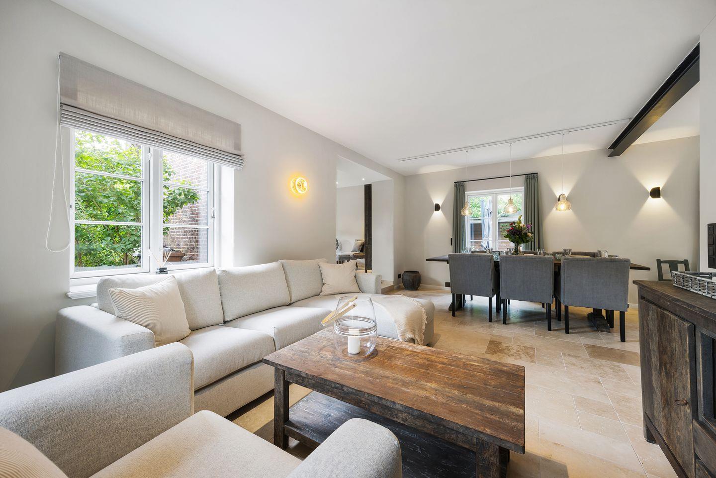 Im stilvoll eingerichteten Wohn- und Essbereich genießen Sie komfortable Stunden mit Ihrer Familie oder Freunden. Der große Esstisch bietet reichlich Platz für gemeinsame Mahlzeiten, während die gemütliche Sofaecke ideal zum Entspannen einlädt. Von hier aus gelangen Sie direkt auf die möblierte Terrasse mit hochwertigen Gartenmöbeln, die zu sonnigen Stunden im Freien einlädt.