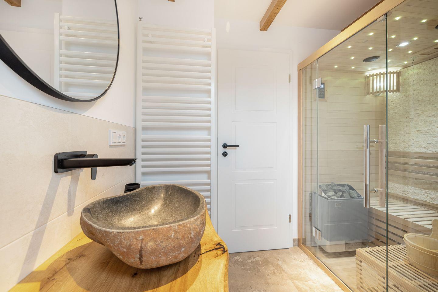 Das moderne Badezimmer ist ein wahres Highlight der Wohnung. Die bodengleiche Dusche und der Tageslichteinfall machen es zu einem einladenden Ort, um den Tag frisch zu beginnen. Nach einem langen Tag können Sie in der integrierten Sauna neue Energie tanken und sich in wohltuender Wärme entspannen.