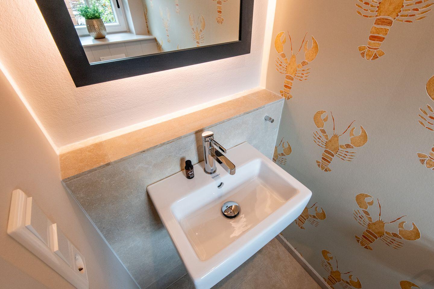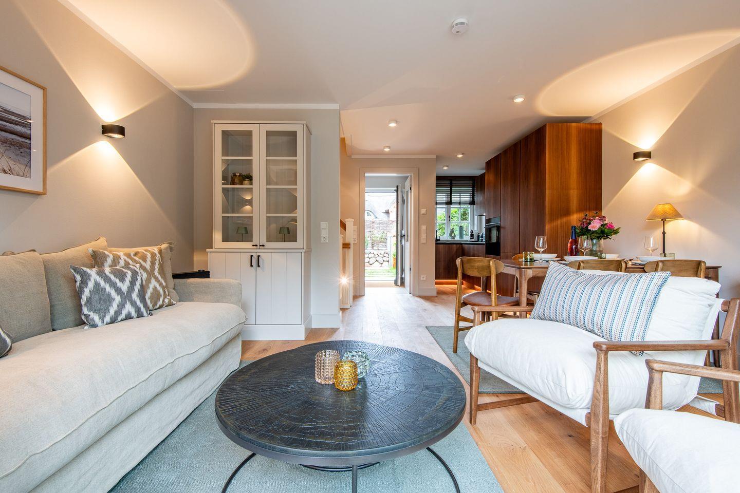 Das großzügige Wohn- und Esszimmer ist der perfekte Ort zum Entspannen und geselligen Beisammensein. Neben einem gemütlichen Sofa und einem Esstisch für 6 Personen erwartet Sie hier der Zugang zur nach Süden ausgerichteten Terrasse und einem idyllischen Garten mit traditionellem Friesenwall – ideal, um die Sonne und die frische Meeresluft zu genießen. Die moderne Ausstattung, gepaart mit stilvollen Details, macht das Wohnzimmer zu einem Ort der Erholung.