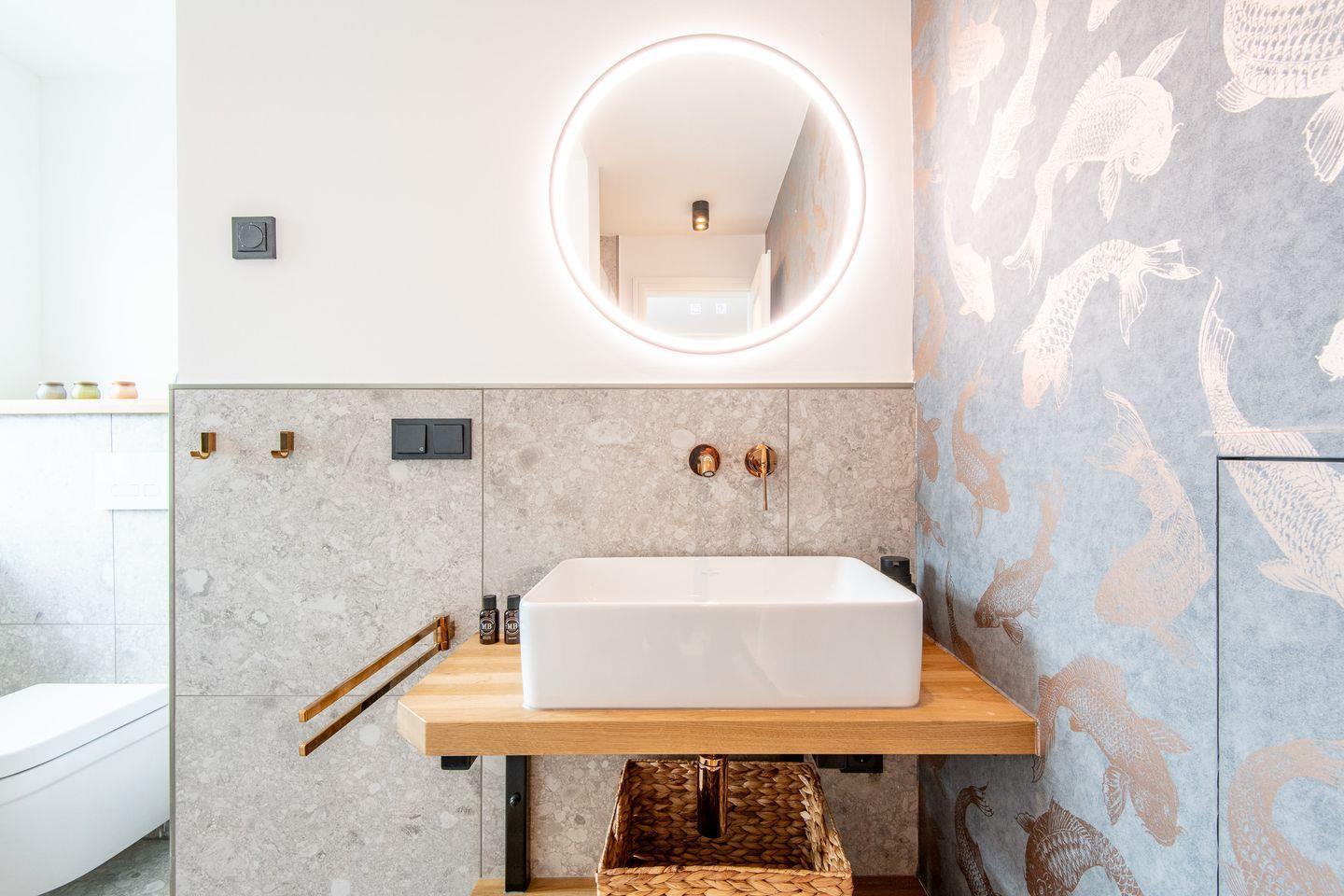 Der stilvolle Wohnbereich mit Parkettboden lädt mit einer bequemen Sofaecke und einem modernen TV zum Entspannen ein. Für zusätzlichen Komfort sorgt die Fußbodenheizung, die jeden Raum behaglich warm hält.
