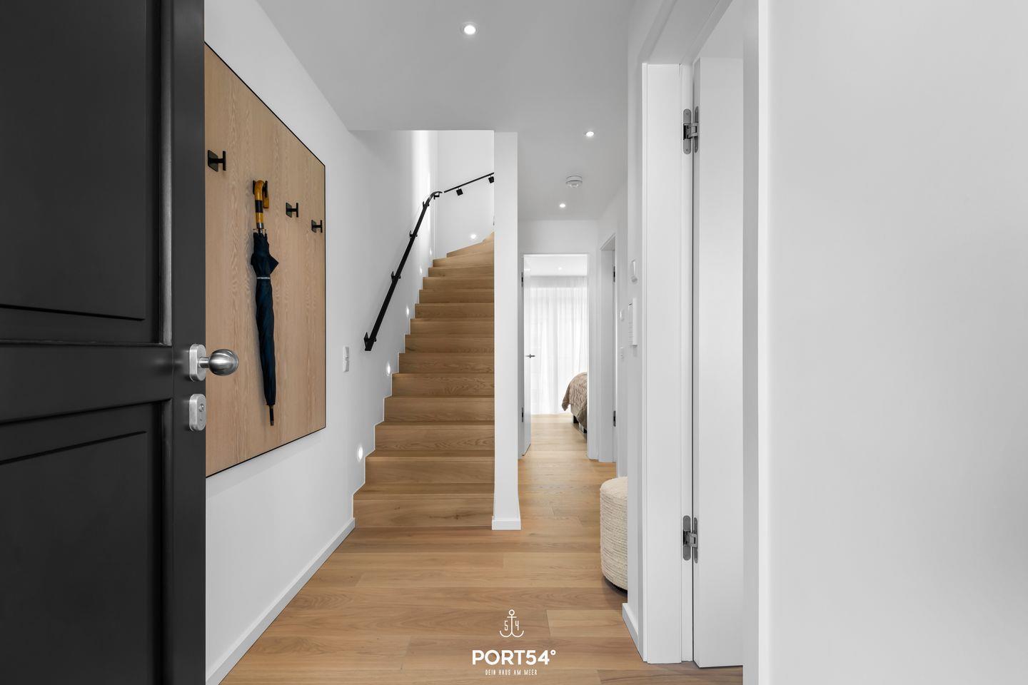 Schlafen im 1. Obergeschoss, kombinierter Wohn- und Essbereich im 2. Obergeschoss. Master-Bedroom im 1. Obergeschoss mit Doppelbett (180 x 200cm) und großem Schrank. Schlafzimmer mit Einzelbett (100 x 200cm) und Schrank. Exklusives Badezimmer mit Waschbecken, großer Regendusche und WC. Wohn- und Essbereich im 2. Obergeschoss mit Sofa und Sessel sowie Esstisch mit vier Stühlen. Hochwertig eingerichtete, offene Küche mit Kühlschrank, Backofen und Herd. Kleiner, luxuriöser Balkon mit Gartenmöbeln. Luxuriöse Dachterrasse auf dem Dach mit Gartenmöbeln, erreichbar über eine Treppe vom 2. Obergeschoss.