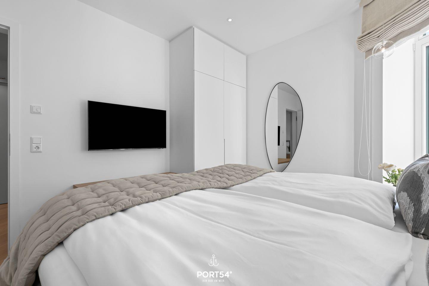 Das Luxus Maisonette Apartment bietet Platz für bis zu vier Personen und erstreckt sich über das erste und zweite Obergeschoss. Auf der ersten Etage befinden sich zwei Schlafzimmer mit großen Doppelboxspringbetten (200x200 cm), Flachbild-TV und Verdunkelungsmöglichkeiten. Eines der Schlafzimmer hat direkten Zugang zum Balkon. Das exklusive Master-Bad ist mit einer großen Regendusche, zwei Waschbecken, Föhn und WC ausgestattet.