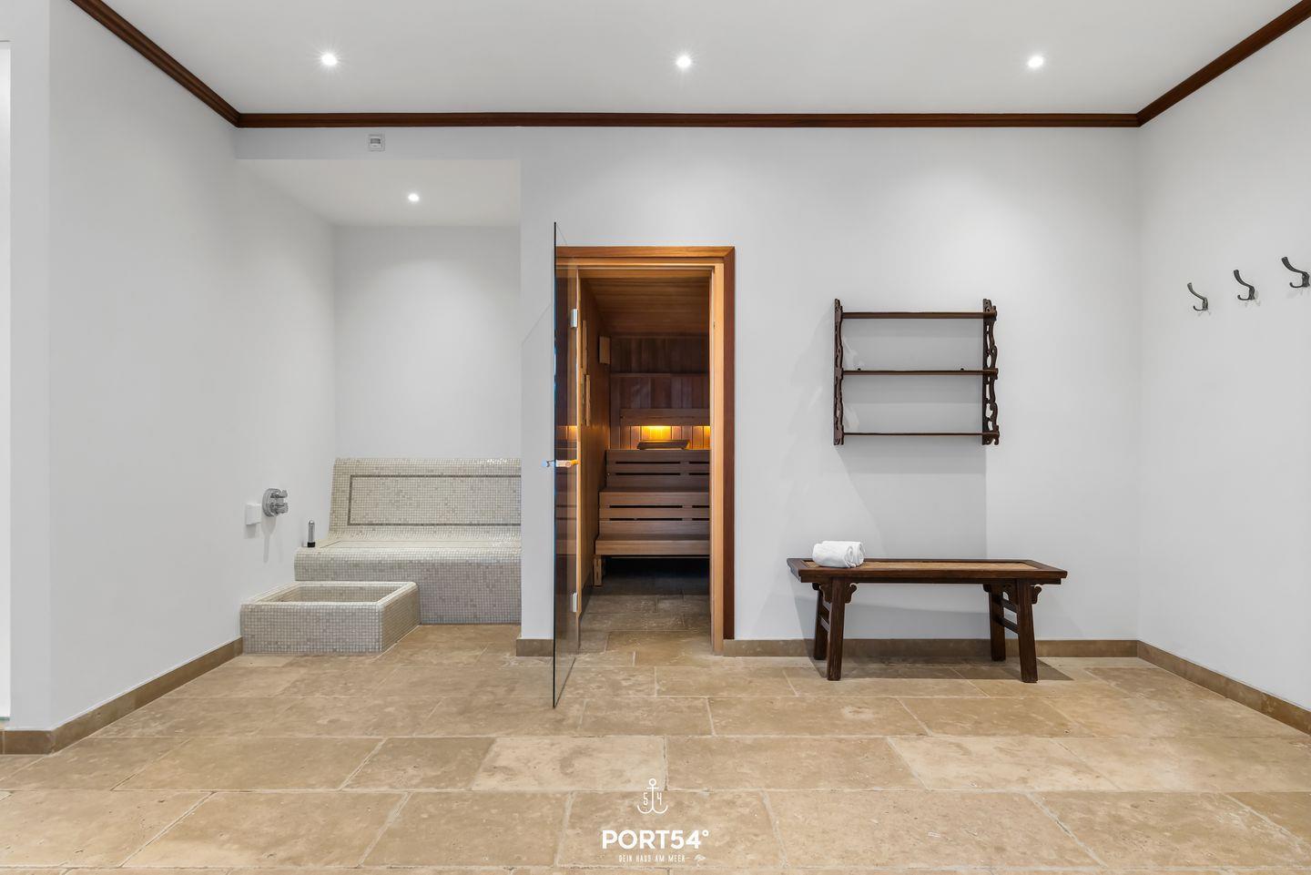 Großer Wohn- und Essbereich mit Sofa und Sessel sowie Esstisch mit vier Stühlen. Hochwertig eingerichtete, offene Küche mit Kühlschrank, Backofen und Herd. Zwei Schlafzimmer in der ersten Etage jeweils mit Doppelbett (200 x 200cm) und großem Schrank. Exklusives angrenzendes Master-Bad mit zwei Waschbecken, großer Regendusche und WC. Luxuriöse Dachterrasse mit Gartenmöbeln und Balkon.