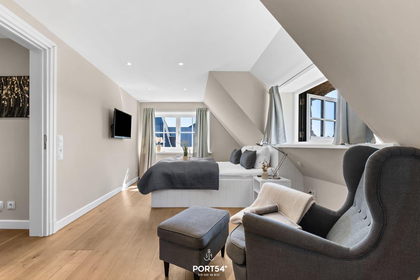 Im Erdgeschoss befindet sich das Gäste-WC, eine offene Küche und der gemütliche Wohnbereich mit Kamin und direktem Zugang zur Terrasse und zum Garten. Lassen Sie den Tag nach einem langen Spaziergang vor dem Kamin ausklingen oder lehnen sich im Strandkorb zurück und genießen den Gartenblick und die Ruhe.