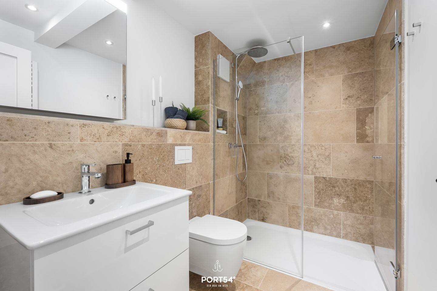 Das moderne Bad mit ebenerdiger Dusche, Naturstein-Fliesen, Handtuchtrockner und Föhn sorgt für Wohlfühlmomente. Fußbodenheizung, Bügelstation und Staubsauger runden die Ausstattung ab.
