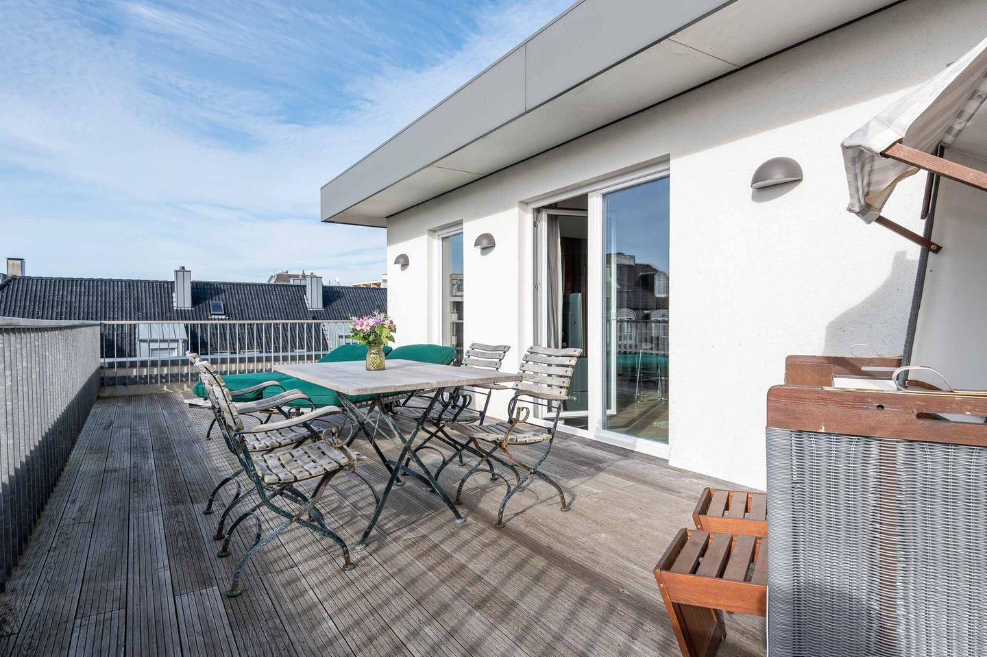 Ein absolutes Highlight ist der private, großzügige Balkon, der mit Sonnenliegen, Gartenmöbeln und einem eigenen Strandkorb ausgestattet ist.