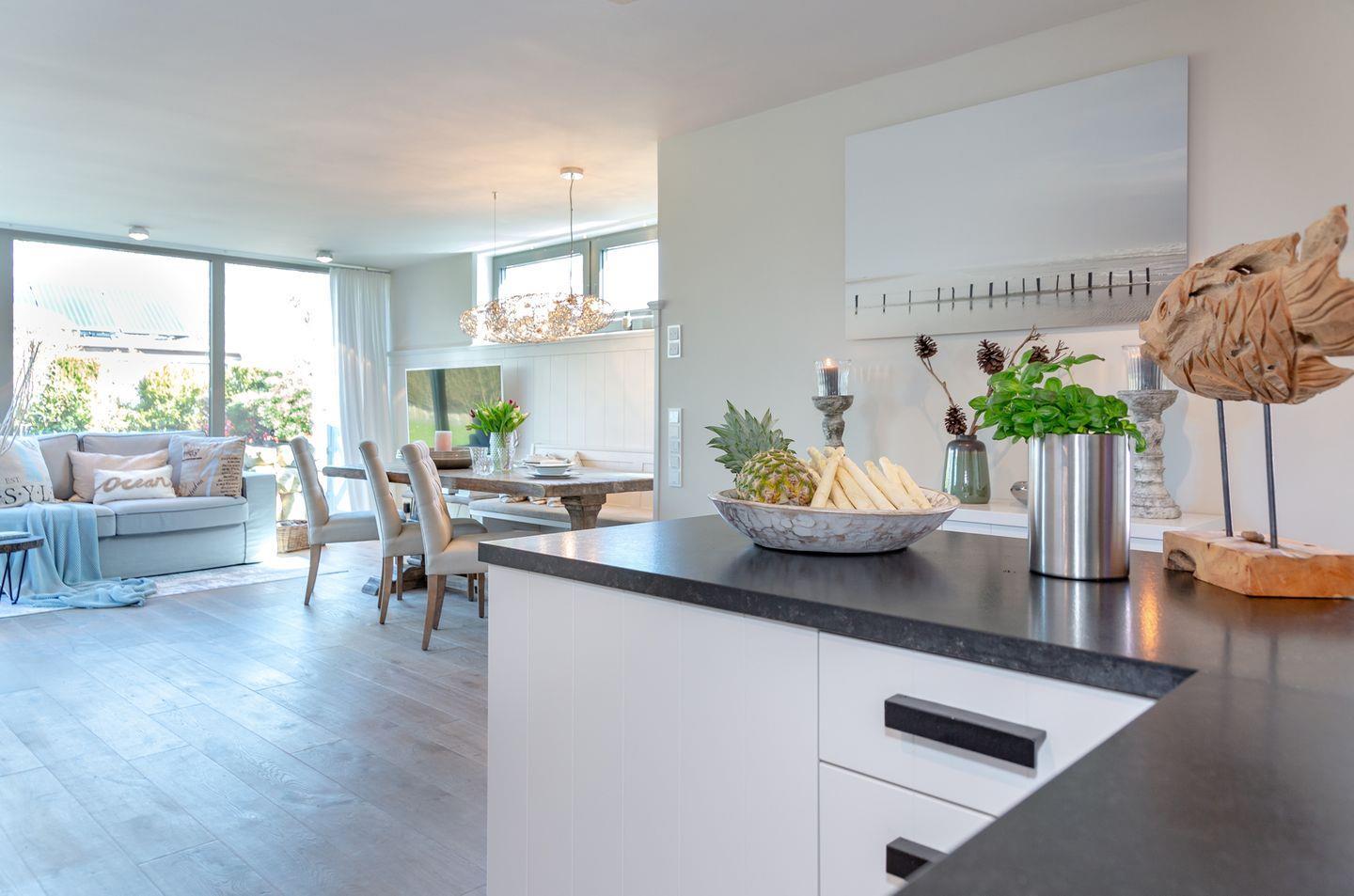 Die offene Designküche mit hochwertigen Geräten von KitchenAid, Weinkühlschrank und zwei Kaffeemöglichkeiten erfüllt kulinarische Wünsche ebenso wie gesellige Runden am Esstisch, der durch Sitzbank und Stühle viel Platz bietet. Hier lässt sich der Abend bei einem guten Glas Wein ebenso zelebrieren wie das ausgedehnte Frühstück mit Blick ins Grüne.