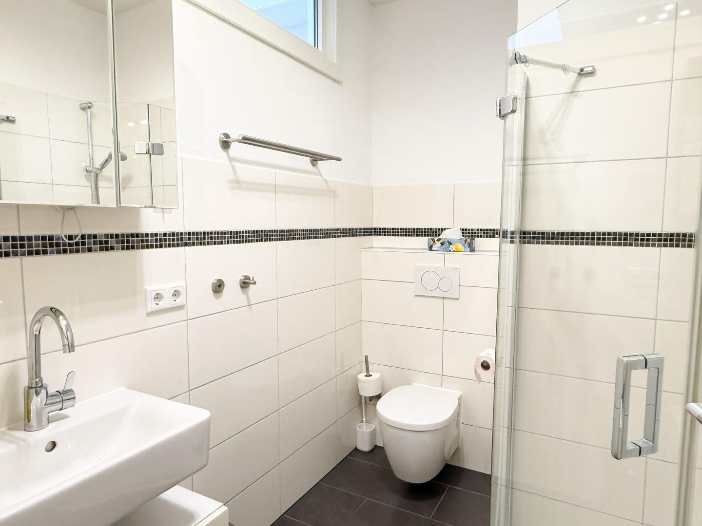 Zwei moderne Badezimmer sorgen für Ihren Komfort: Eines ist mit einer bodengleichen Dusche, Waschbecken, Spiegel, Fenster, WC und Haartrockner ausgestattet. Alle notwendigen Sanitäreinrichtungen wie warmes Wasser, Ganzkörperspiegel und zusätzliche Spiegel sind vorhanden.