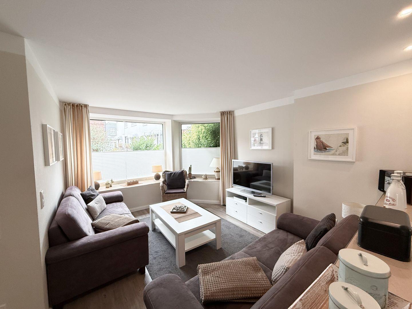 Die Wohnung Maritim auf Sylt bietet auf 3 Zimmern und 2 Schlafzimmern Platz für bis zu 4 Personen. Es besticht durch eine offene Küche mit moderner Ausstattung, zwei Badezimmer, kostenfreies WLAN sowie eine Terrasse mit Gartenmöbeln. Der Sandstrand liegt nur 400 Meter entfernt, Einkaufsmöglichkeiten und Restaurants befinden sich in unmittelbarer Nähe. Haustiere sind willkommen.