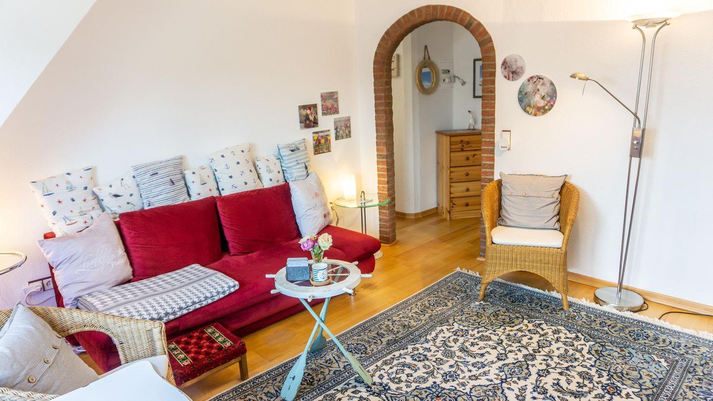 Insgesamt können 4 Gäste komfortabel untergebracht werden. Das Wohnzimmer ist gemütlich gestaltet und bietet eine Sofaecke, Sessel und moderne Unterhaltungselektronik wie einen Fernseher und ein Radio.