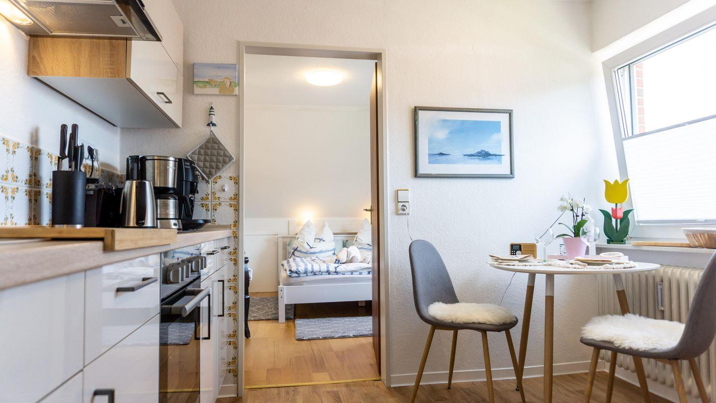 Im offen gestalteten, geschlossenen Küchenbereich mit Esstisch erwartet Sie eine hochwertige Küchenausstattung: Herd, Backofen, Mikrowelle, Kühlschrank mit Gefrierfach, Geschirrspüler, Kaffeemaschine und Automat, Wasserkocher, Toaster, Mixer sowie umfangreiches Koch- und Essgeschirr lassen keine Wünsche offen und machen die Selbstversorgung einfach. Ein Essbereich lädt zum gemeinsamen Speisen ein.