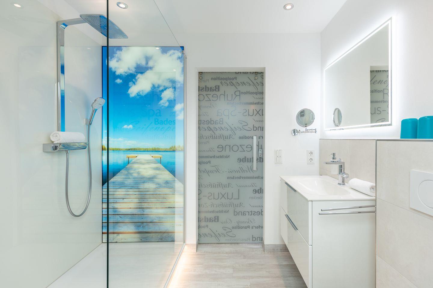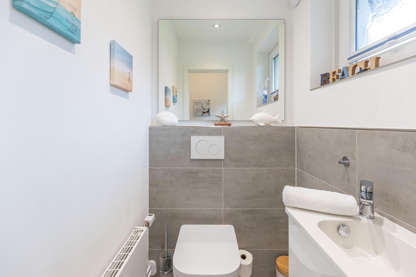 Das Badezimmer (1. OG) ist hell und modern gestaltet und verfügt über eine Dusche, WC, Waschtisch, Kosmetikspiegel und ein Fenster, das für angenehmes Tageslicht sorgt. Ein zusätzliches Gäste-WC erhöht den Komfort für Familien und kleine Gruppen. Fußbodenheizung und Öl-Heizung schaffen ein angenehmes Raumklima, während Waschmaschine, Trockner, Bügeleisen, Bügelbrett und ein Wäscheständer den Alltag während des Aufenthalts erleichtern. Sichtschutz an allen Fenstern sowie ein Ganzkörperspiegel runden den Komfort ab.
