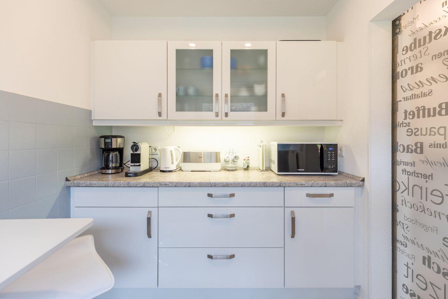 Die geschlossene Küche wurde umfassend modernisiert und ist vollständig ausgestattet, um sowohl einfache Mahlzeiten als auch aufwendige Gerichte problemlos zuzubereiten. Neben modernen Küchengeräten stehen zahlreiche praktische Helfer sowie eine Auswahl an Gewürzen zur Verfügung. Der angrenzende Essbereich bietet ausreichend Platz für gemeinsame Mahlzeiten in entspannter Atmosphäre und fördert das gesellige Zusammensein.