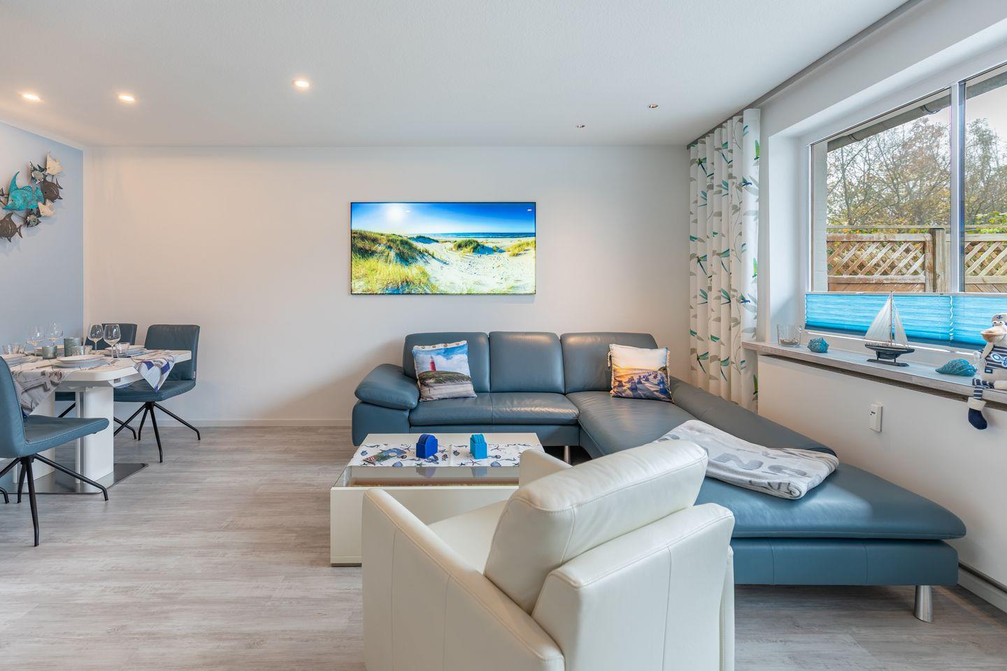 Im Wohnbereich erwartet Sie eine einladende Atmosphäre mit einem komfortablen Sofa, Sessel und einem SAT-Fernseher und Magenta, die es jedem Gast ermöglichen, individuelle Medienwünsche zu erfüllen. Ergänzt wird die Unterhaltung durch eine HiFi-Anlage, Radio, CD-Spieler, eine kleine Auswahl an Musik und Gesellschaftsspielen, sodass auch bei weniger gutem Wetter abwechslungsreiche Stunden garantiert sind.