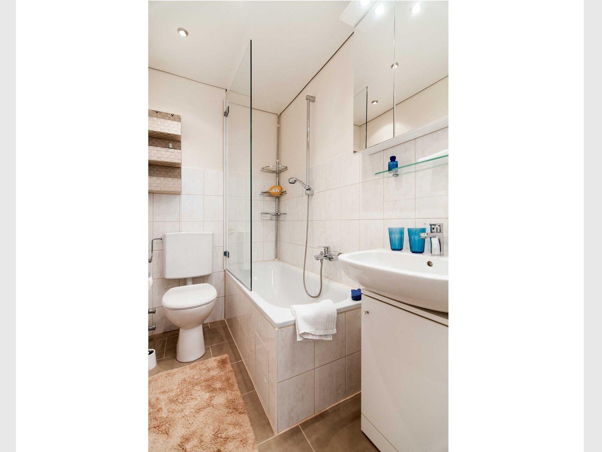 • Badezimmer mit Badewanne und Duschtrennwand, Waschbecken, Spiegelschrank, WC und Haartrockner