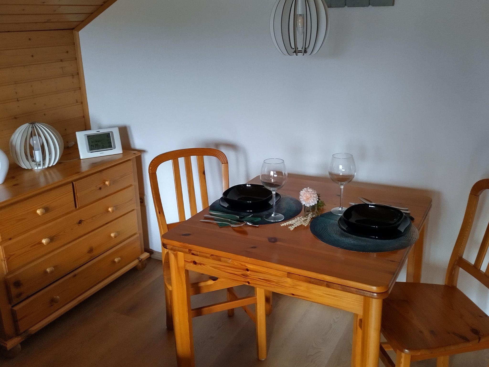 Die mit viel Liebe zum Detail eingerichtete Ferienwohnung verfügt über einen großzügigen Wohn- und Essbereich. Zum Verweilen lädt die bequeme Sofalandschaft ein. Von hier aus haben Sie direkten Zugang zum großzügig geschnittenen Balkon mit weiteren bequemen Sitzmöglichkeiten und Blick in die Naturlandschaft. Ein idealer Wohlfühlort, um den Alltag hinter sich zu lassen.