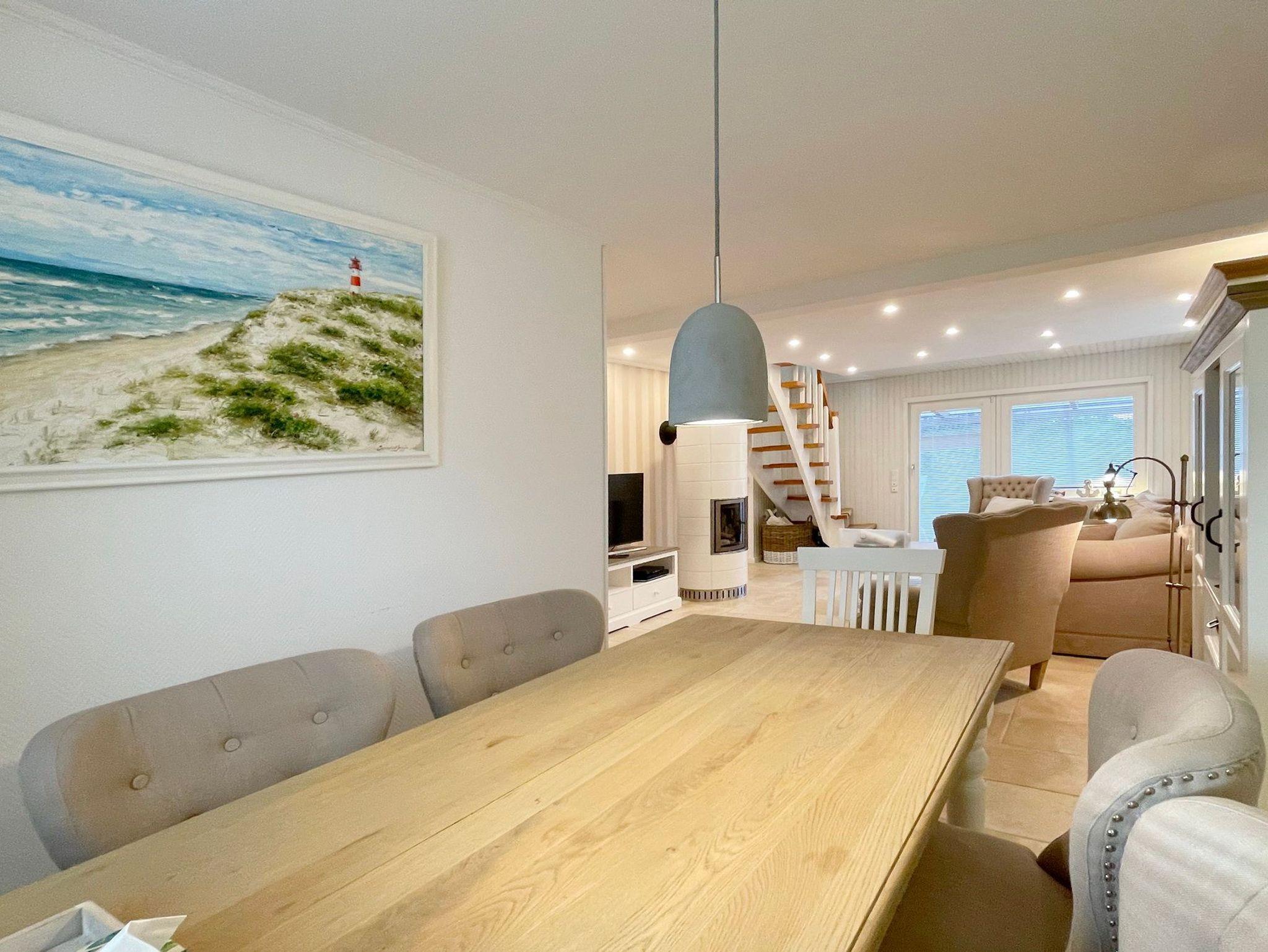 EG: Wohnzimmer mit Kachelofen, Essbereich, Couch, 2 Sessel und Smart-TV. Flur, Duschbad und Hauswirtschaftsraum mit Wasch-/Trockner Kombigerät und Kleiderschrank.