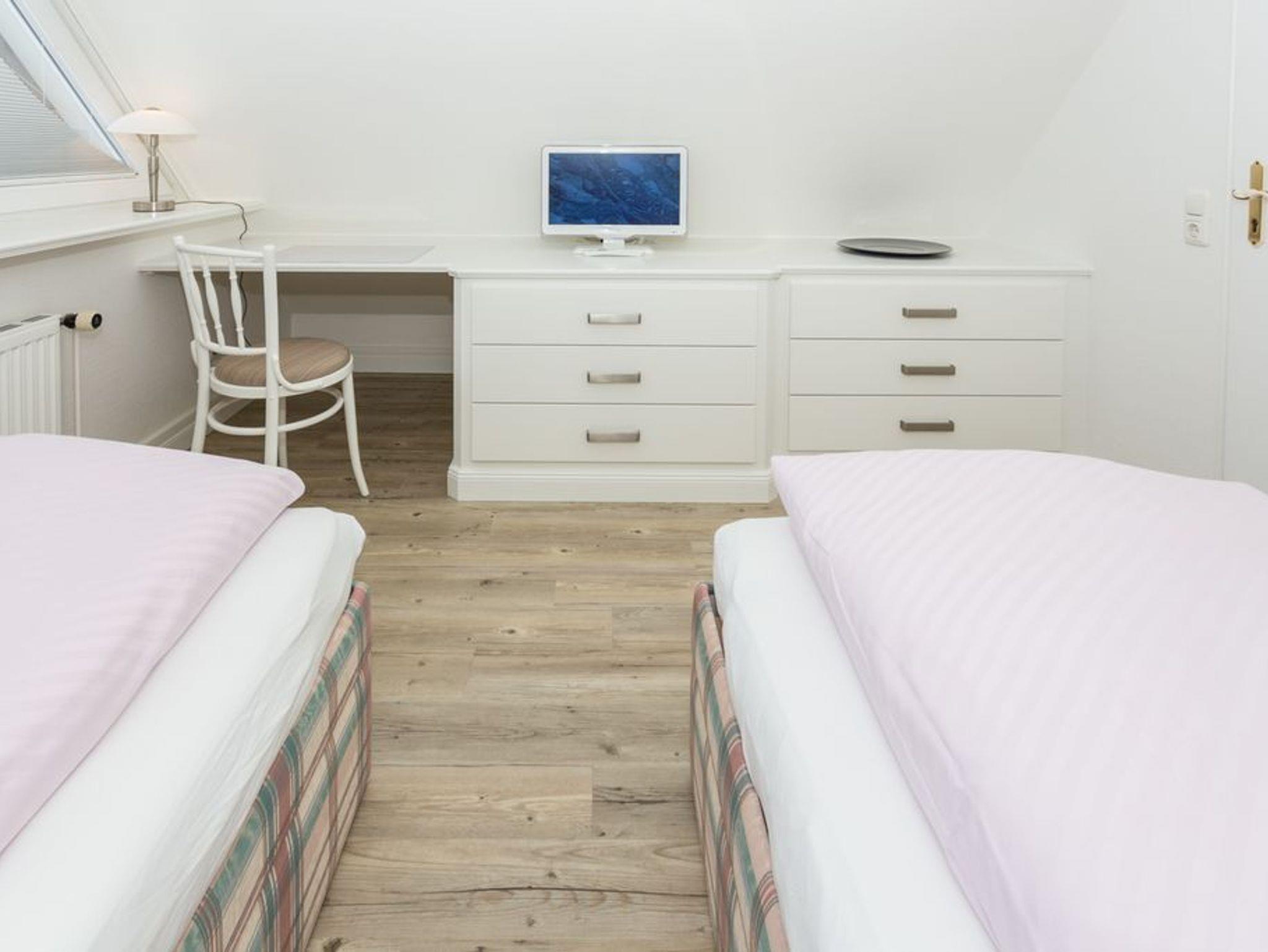 Die geräumige 3-Zimmer-Ferienwohnung für 4 Personen, ca. 65m², erstreckt sich über zwei Ebenen. Im Obergeschoss befinden sich ein Duschbad / WC, Wohnzimmer mit Essplatz sowie Sitzgruppe, Flat-TV, Radio, Telefon und kostenfreiem W-Lan. Die Küchenzeile ist zum Wohnraum offen mit Geschirrspüler und Mikrowelle ausgestattet. Waschmaschine sowie Trockner sind gemeinschaftlich auf der gleichen Ebene im Obergeschoß nutzbar. Eine Treppe ins Dachgeschoss führt zu zwei separaten Schlafzimmern (alle Betten sind wahlweise als Einzel- oder Doppelbetten stellbar) und einem kleinen Abstellraum. Bettwäsche und Handtücher sind zur Anreise aufgezogen. Ein Pkw-Stellplatz befindet sich vor dem Haus. Der gemeinschaftliche Außenbereich bietet einen Terrassenplatz mit Strandkorb und Gartenmöbeln, einen überdachten Sitzbereich, einen großzügigen Fahrradunterstand sowie Schränke für Ihre Golfbags. Tierhaltung ist nicht gestattet.