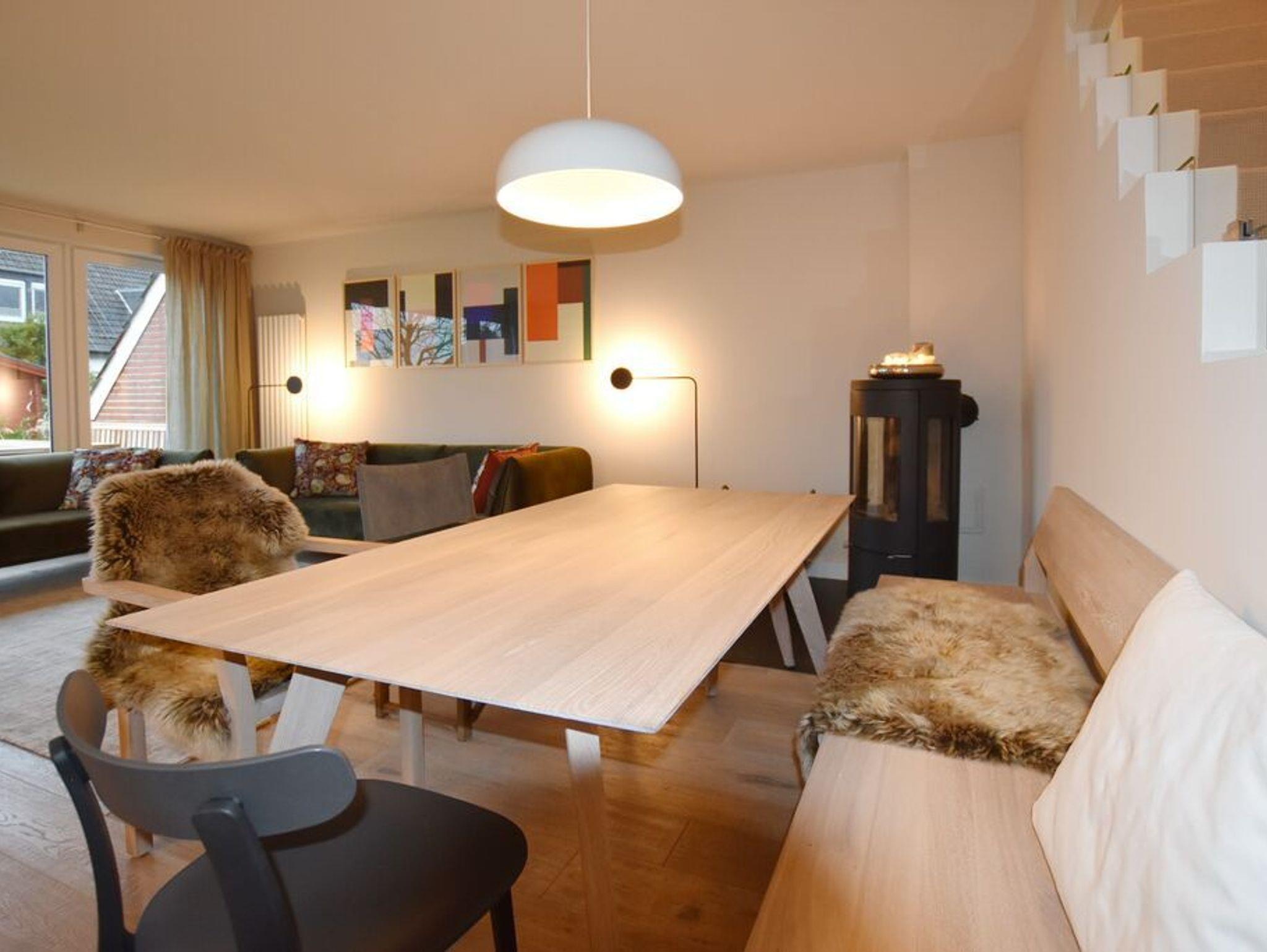 Der helle großzügige Wohn- und Essbereich mit Kaminofen sowie die offene moderne Küche bieten im Erdgeschoss viel Platz zum Entspannen, Essen und Kochen. Die Küchenausstattung lässt keine Wünsche offen. Für ruhige Abende stehen moderne Unterhaltungsmedien (u.a. mit Netflix und Disney+) zur Verfügung. Im Obergeschoss befinden sich zwei große Schlafzimmer und ein modernes Duschbad mit bodentiefer Regen-Dusche. Ein zusätzliches großes Zimmer mit Duschbad liegt im Dachgeschoss. Die stilvollen und liebevollen Einrichtungsdetails runden das positive Gesamtbild ab.