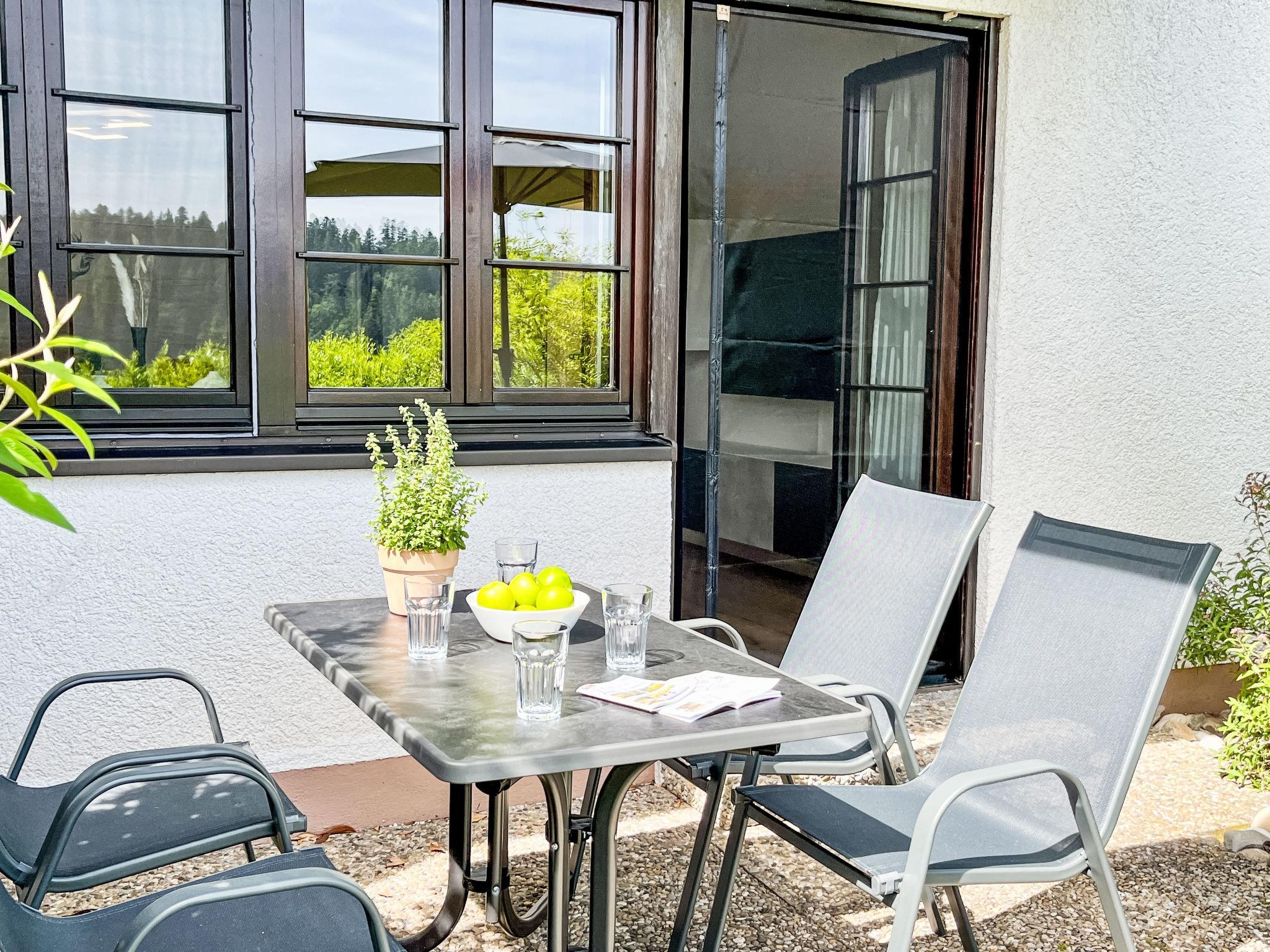 "Tannenblick", 2-room apartment 60 m2, lower ground floor. Partly renovated in 2025, beautiful and modern furnishings: entrance hall. Living/sleeping room with 1 double sofabed (160 cm, length 200 cm), 1 folding bed (80 cm, length 190 cm), dining nook, satellite TV and digital TV (flat screen). Exit to the terrace. 1 room with 1 double bed (2 x 90 cm, length 200 cm). Small kitchen (oven, dishwasher, 4 ceramic glass hob hotplates, toaster, kettle, microwave, electric coffee machine). Bath/WC. Heating. Terrace. Terrace furniture. Beautiful view of the mountains and the forest. Facilities: children's high chair, baby cot, hair dryer. Internet (WiFi, free). Parking space n 17 at the house. Please note: non-smokers only. Smoke alarm, fire extinguisher, no lift. Bed layout is flexible. There are more sleeping options available than the maximum number of people allowed which may, however, not be exceeded.