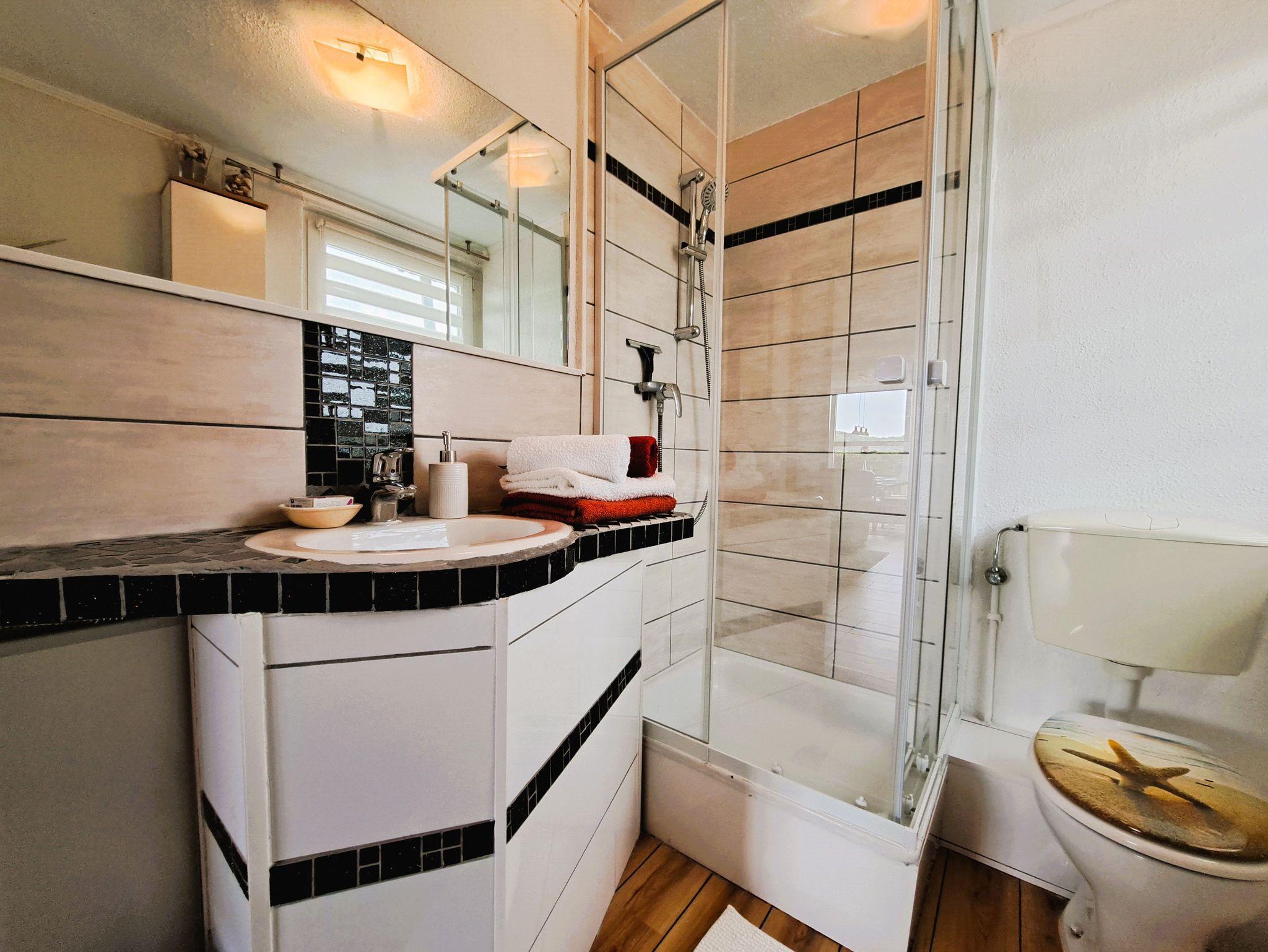 Im Tageslichtbad erwartet Sie eine erfrischende Dusche, ein Waschtisch und ein WC.