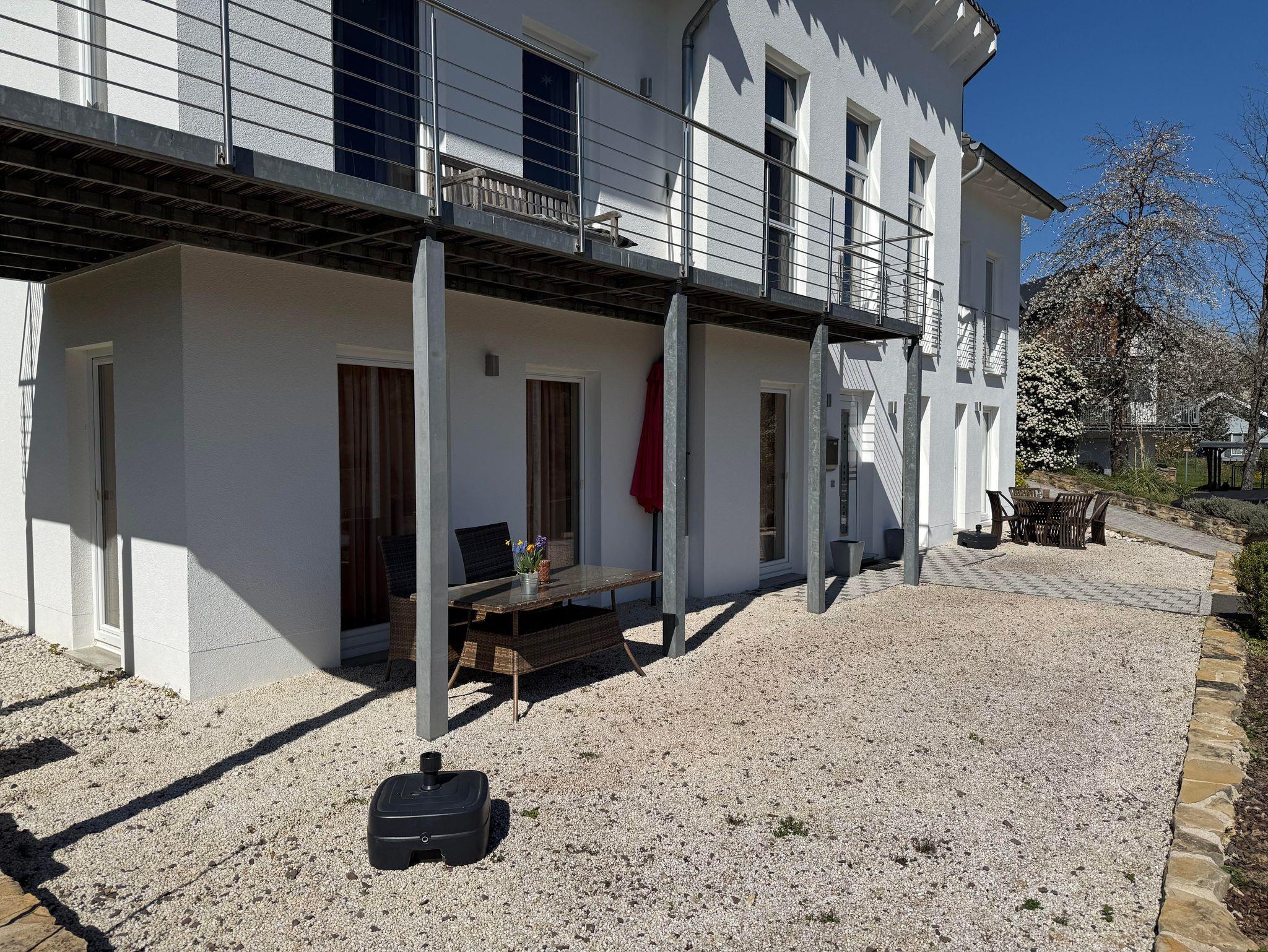 Schöne Aussicht von der eigenen Terrasse mit Gartenmöbeln (Sonnenschirm vorhanden).