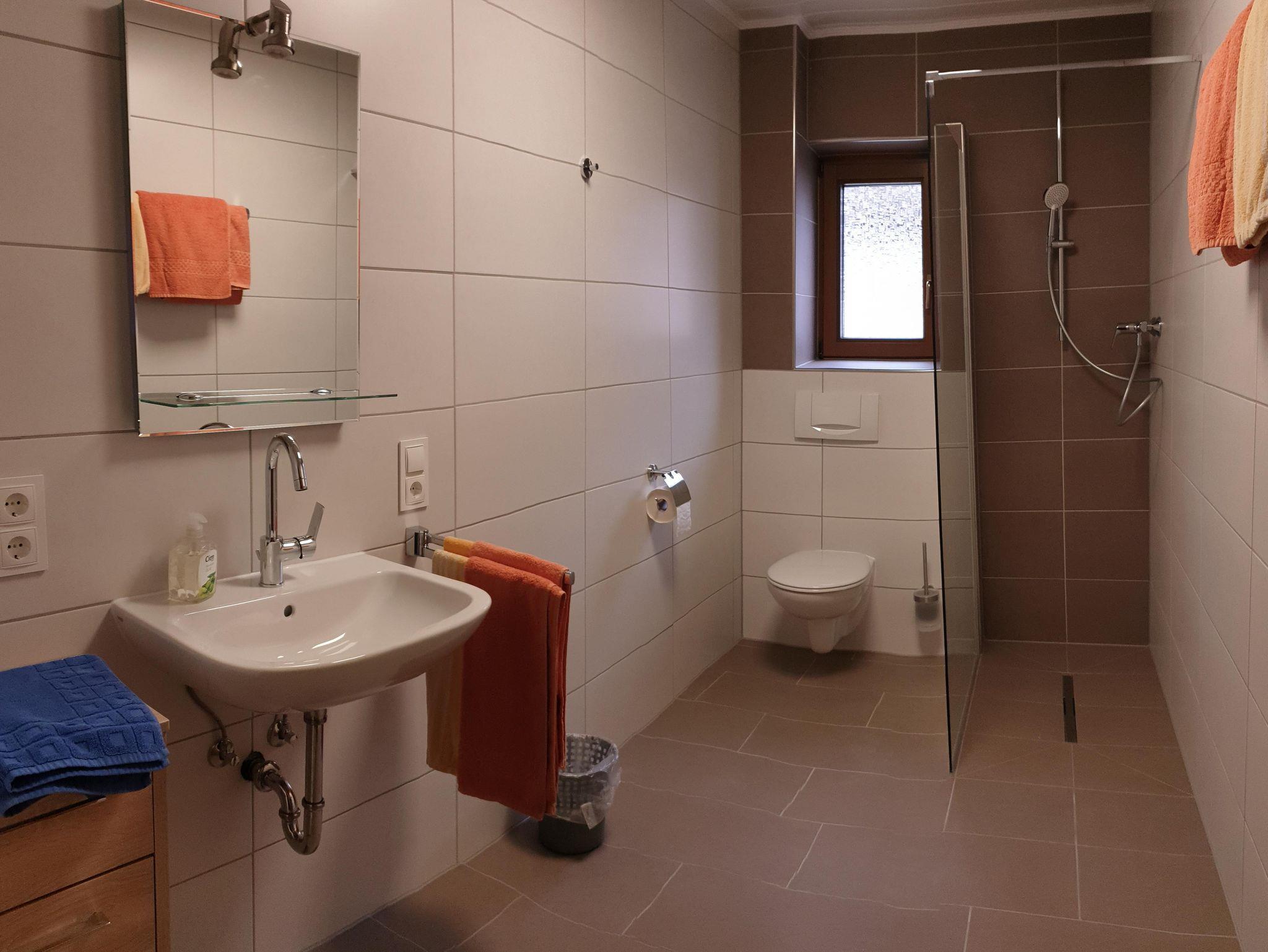 Wohnbereich mit TV, Essecke, neu renoviertes ebenerdiges Bad.