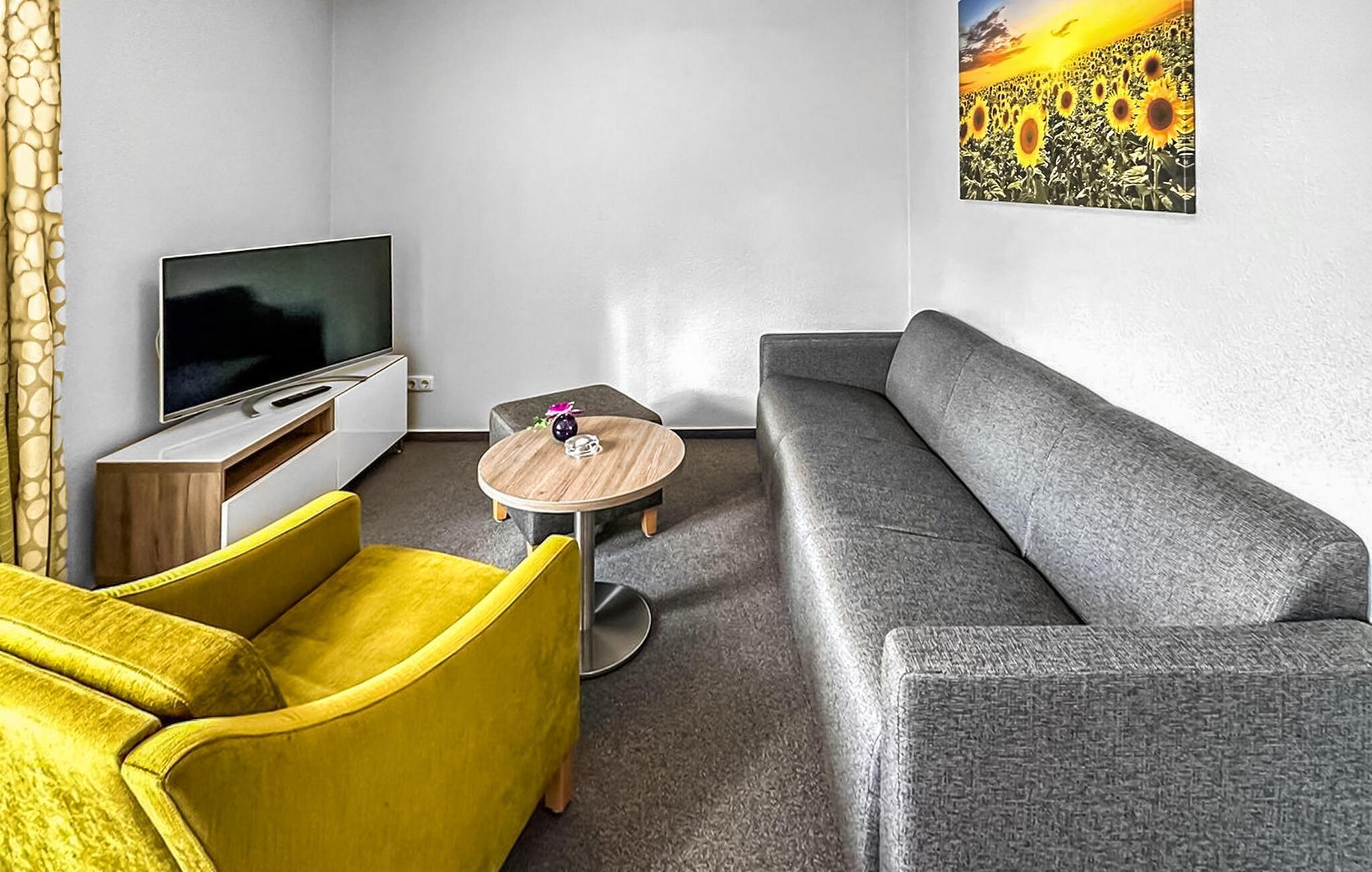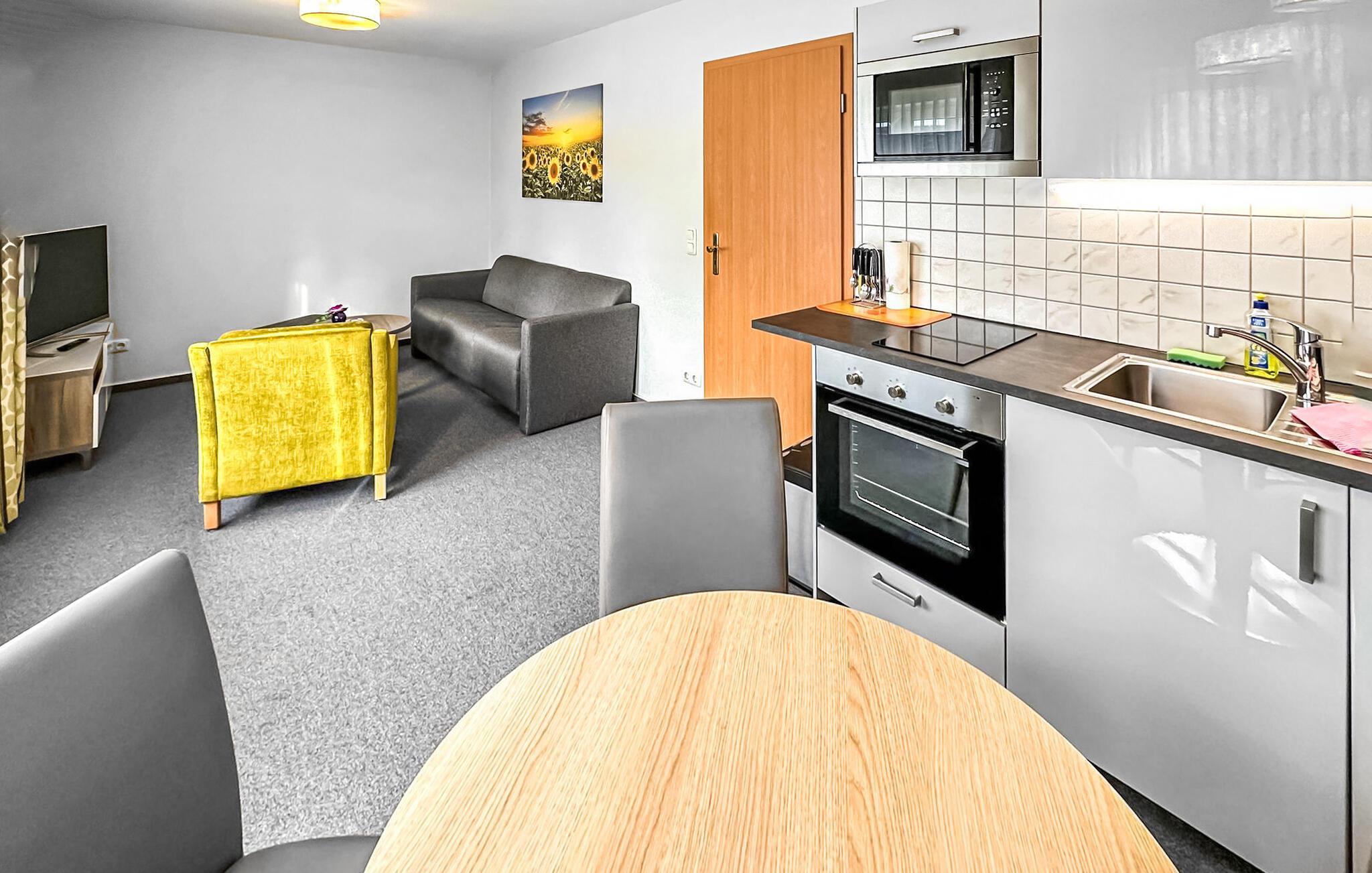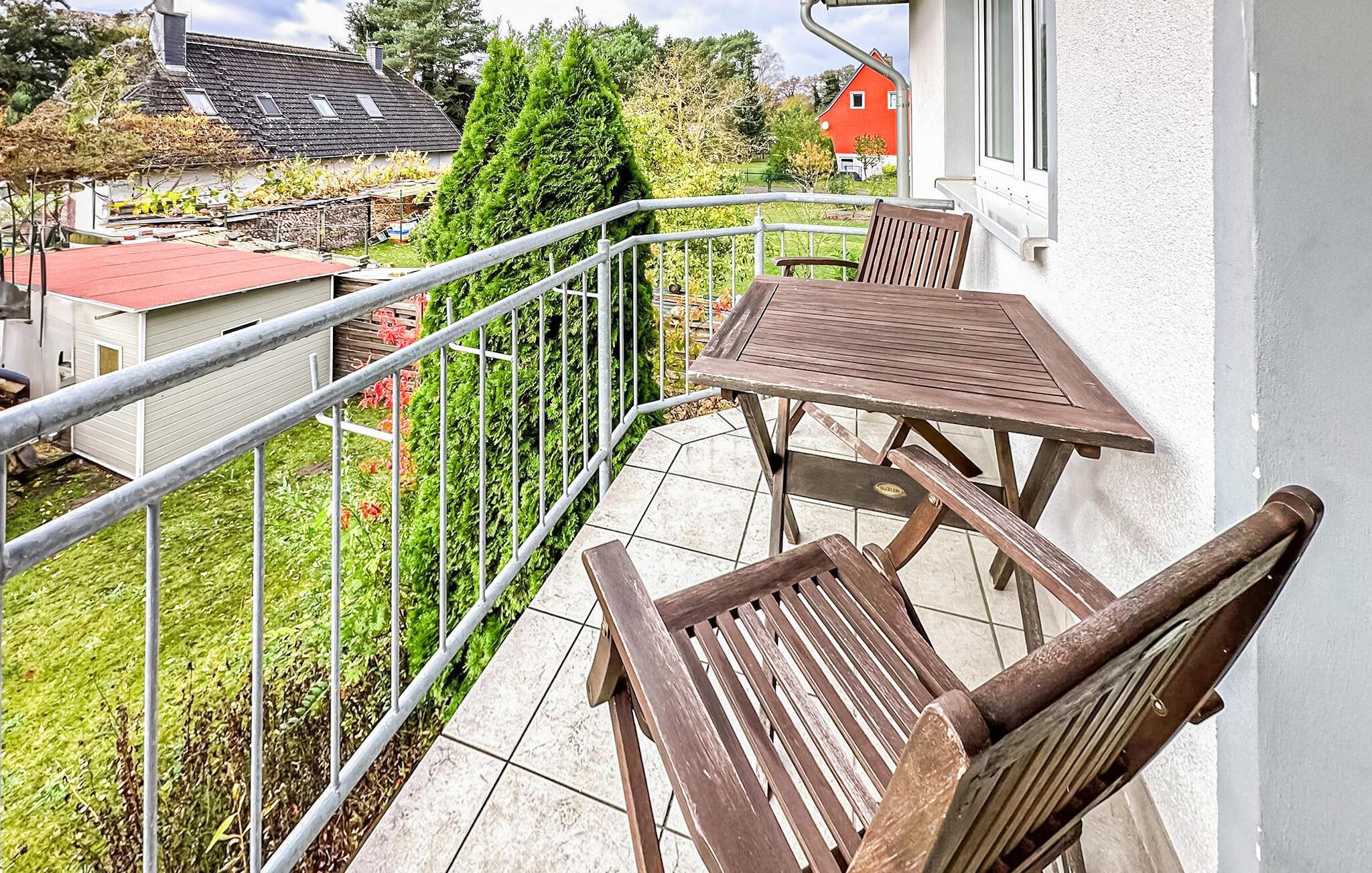 3-rumslägenheten med 62 kvadratmeter för 4 personer ligger på översta eller översta våningen och nås via en central trappa. Den har ett vardagsrum med matbord och pentry i öppen planlösning (stoppade möbler, platt-TV, matbord, elspis, ugn, kylskåp med frysfack, mikrovågsugn, diverse köksmaskiner), ett badrum med dusch/WC och ett sovrum med dubbelsäng (anslutande rum till badrummet). En utrymmesbesparande trappa leder till ett annat vardagsrum/sovrum med 2 enkelsängar, TV och sittmöbler. Det finns också en möblerad balkong. En barnsäng och barnstol kan tillhandahållas för små barn. WLAN finns också tillgängligt. För varje lägenhet på fastigheten finns en parkeringsplats, cykelställ och en central grillplats på grannfastigheten.