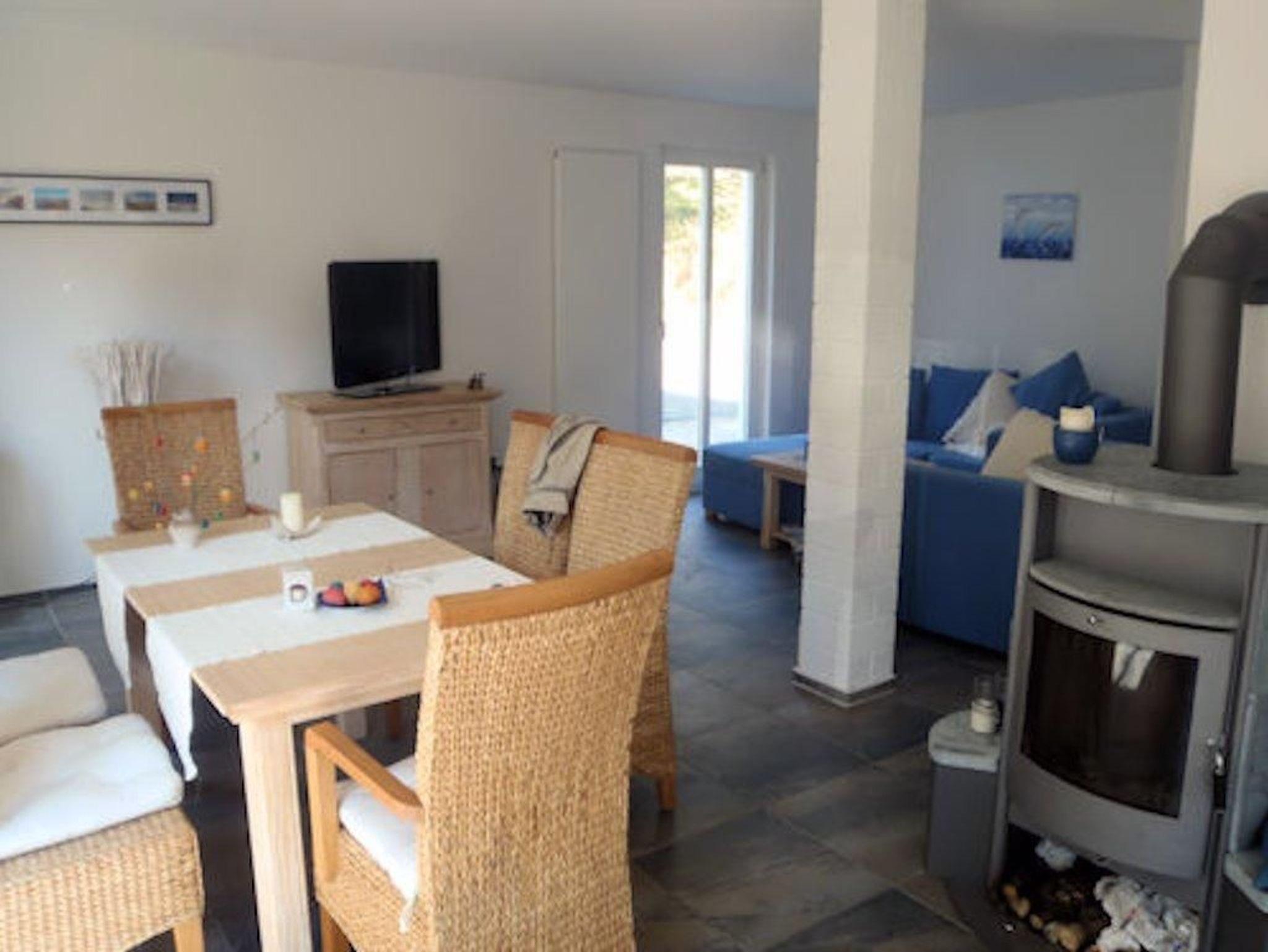 Eine Terrasse, auf welcher Sie Sitzmöbel und einen Strandkorb vorfinden, lädt Sie zum Entspannen oder Grillen ein (Grill ist vorhanden - muss durch den Gast gereinigt werden). Darüber hinaus stehen Ihnen eine Waschmaschine und zwei Parkplätze zur Verfügung. Das Ferienhaus ist nicht komplett eingezäunt.