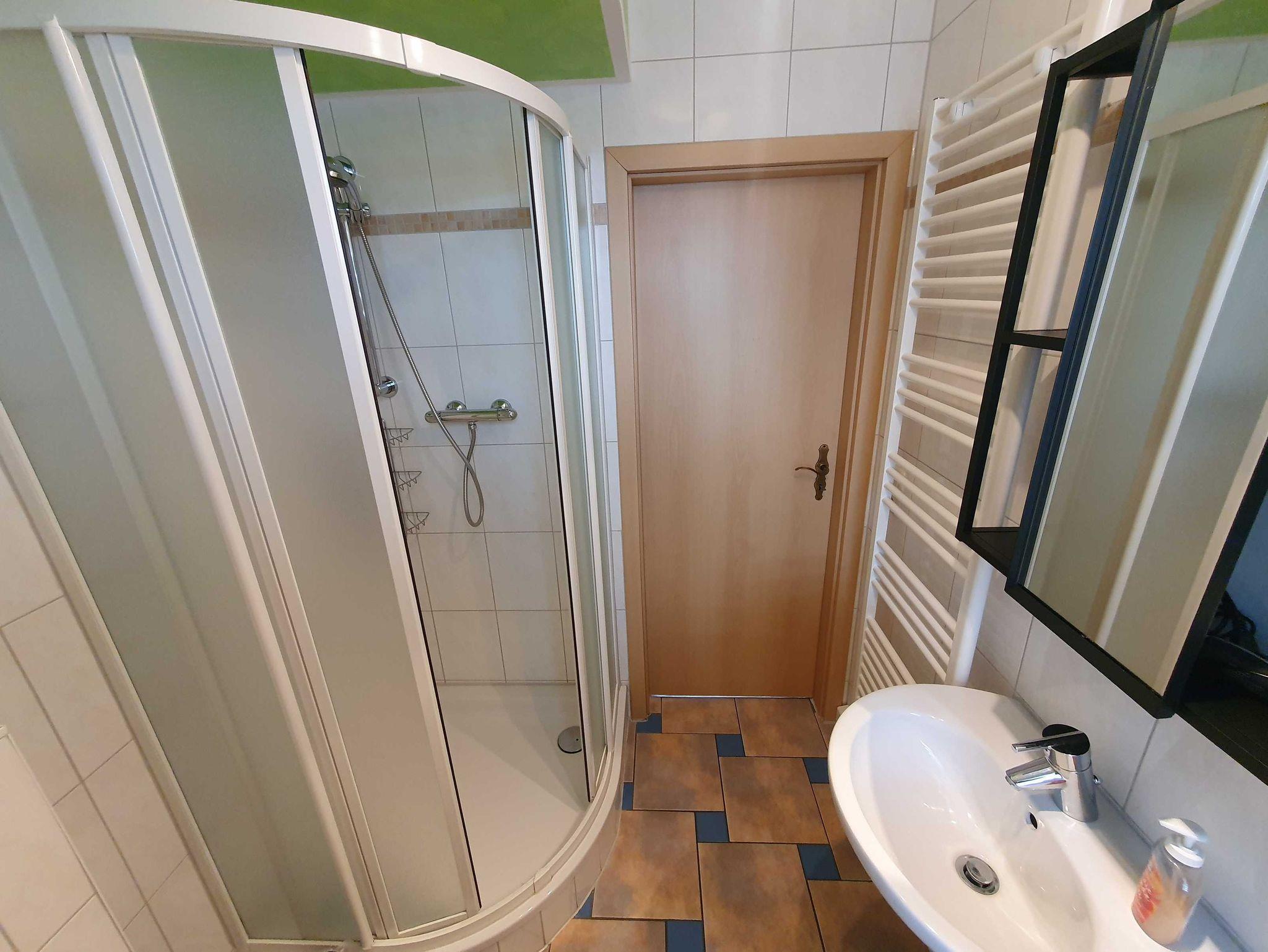 Die Ferienwohnung befindet sich im 1. OG und ist über eine Außentreppe zu erreichen. Sie verfügt über zwei Schlafzimmer (1x Doppelbett, 1x 2 Einzelbetten und zus. TV), einer voll ausgestatteten Küche mit Backofen, Kühlschrank mit Gefrierfach, Wasserkocher, Toaster und Kaffeemaschine. Der Wohn- und Essbereich verfügt über einen Flat-TV und einen Kamin für gemütliche Stunden. Das Badezimmer ist mit Dusche/WC, Waschmaschine und Fön ausgestattet. Die Fußböden sind teilweise mit Teppich im Wohn- und Schlafbereich, mit Linoleum im Küchen- und Essbereich und mit Fliesen im Bad ausgelegt. Die Wohnung hat eine separate Sitzmöglichkeit im Außenbereich. Ein PKW-Stellplatz und WLAN stehen Ihnen kostenfrei zur Verfügung.