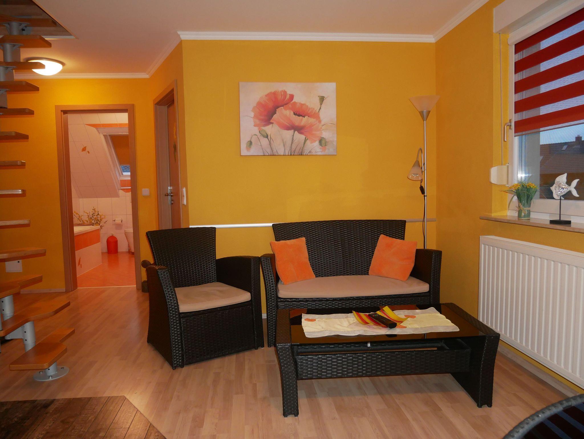Der kombinierte Wohn- und Essbereich befindet sich in der unteren der zwei Etagen. Dort finden Sie eine gemütliche Sitzecke mit SAT/TV.