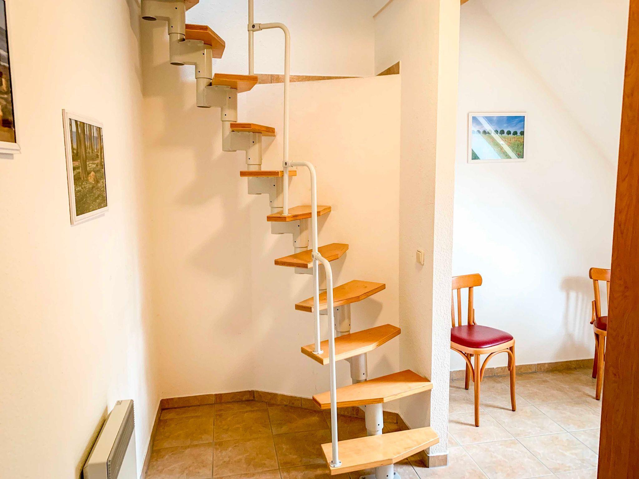 Zwei der Ferienwohnungen befinden sich im 1. Obergeschoss und sind über eine Außentreppe zugänglich. Diese Wohnungen haben ein Schlafzimmer mit Doppelbett auf der ersten Etage und ein zweites Schlafzimmer mit zwei Einzelbetten im Spitzboden, das über eine Raumspartreppe erreicht wird. Bitte beachten Sie, dass diese Treppe sehr steil ist und für Personen mit körperlichen Einschränkungen oder kleinere Kinder ungeeignet sein könnte. Jede dieser Wohnungen bietet außerdem einen Balkon, der mit Sitzmöbeln ausgestattet ist.
