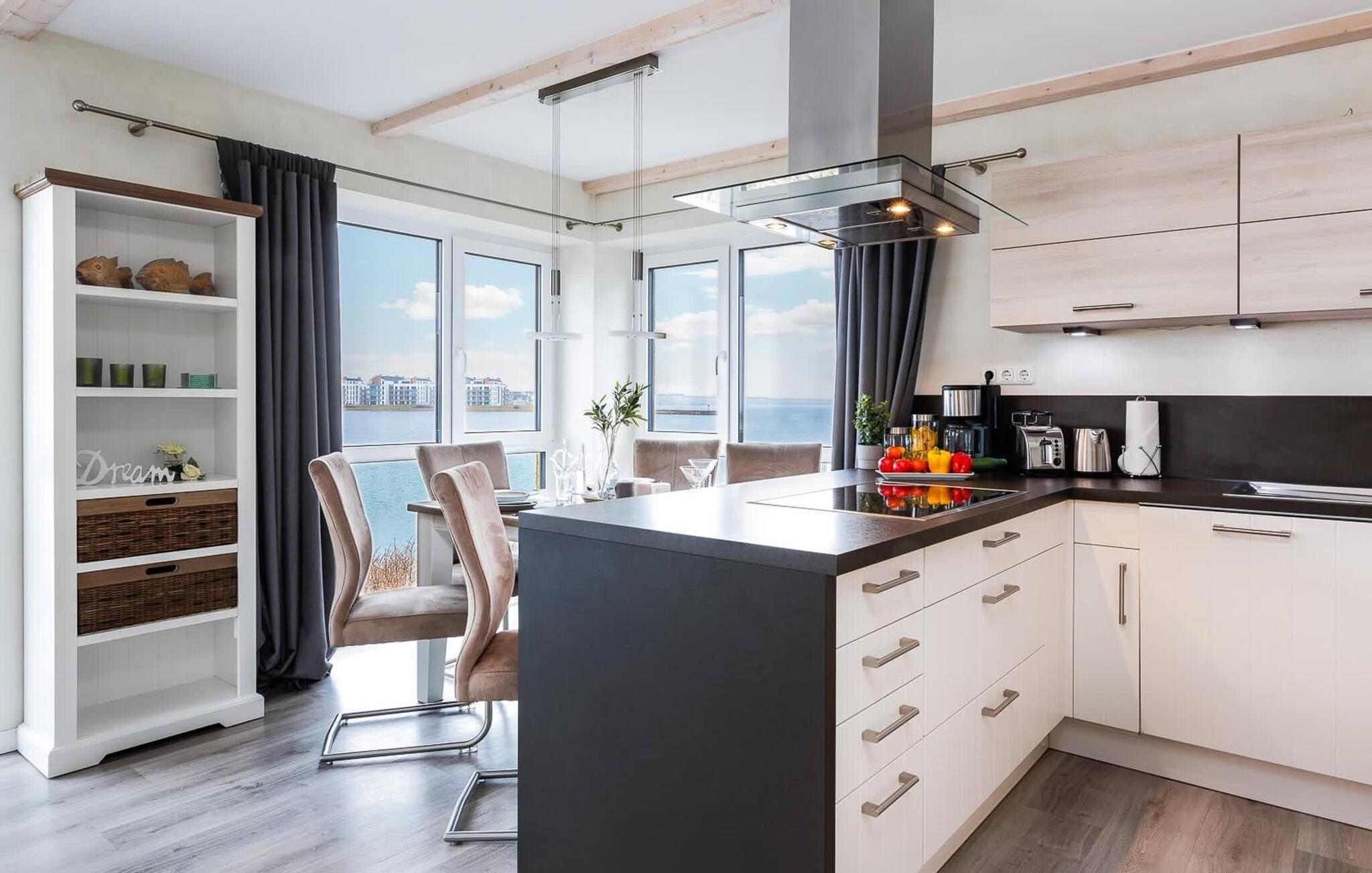 Semesterlägenheten är av mycket hög kvalitet och stilfullt inredd i naturliga toner och medvetet klara och enkla former. Den erbjuder allt du behöver för en lyckad semester vid havet. Det rymliga vardagsrummet/matplatsen med fönster från golv till tak, sittgrupp och stort matbord för 6 personer är lägenhetens mittpunkt. Här kan du tillbringa mysiga stunder framför den vedeldade kaminen och njuta av måltider tillsammans, som kan trollas fram i det fullt utrustade köket.