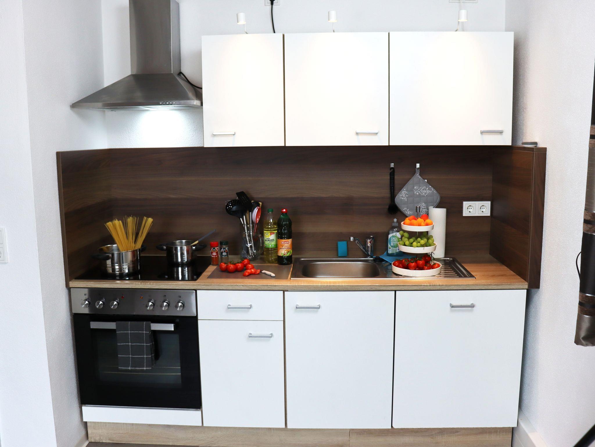 Herd, Backofen, Mikrowelle, Toaster, Wasserkocher, Kaffee- und Geschirrspülmaschine sowie Geschirr, Töpfe, Kuchen- und Auflaufformen sind vorhanden.