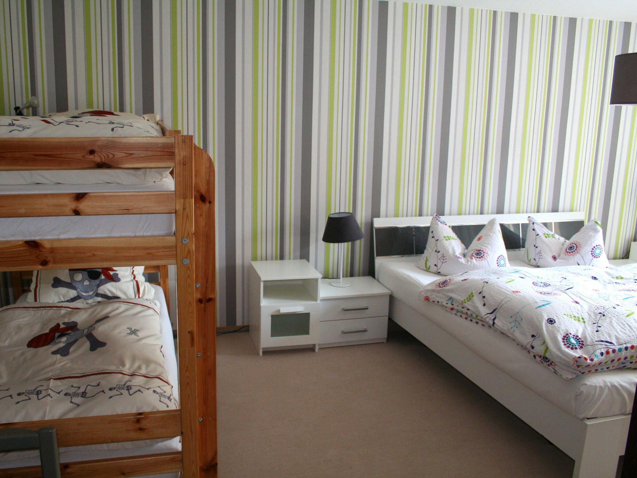 Das Schlafzimmer ist schön geräumig und bietet Platz für die ganze Familie: Die Erwachsenen schlafen bequem in einem großen Doppelbett, während die Kinder in einem Etagenbett träumen können.