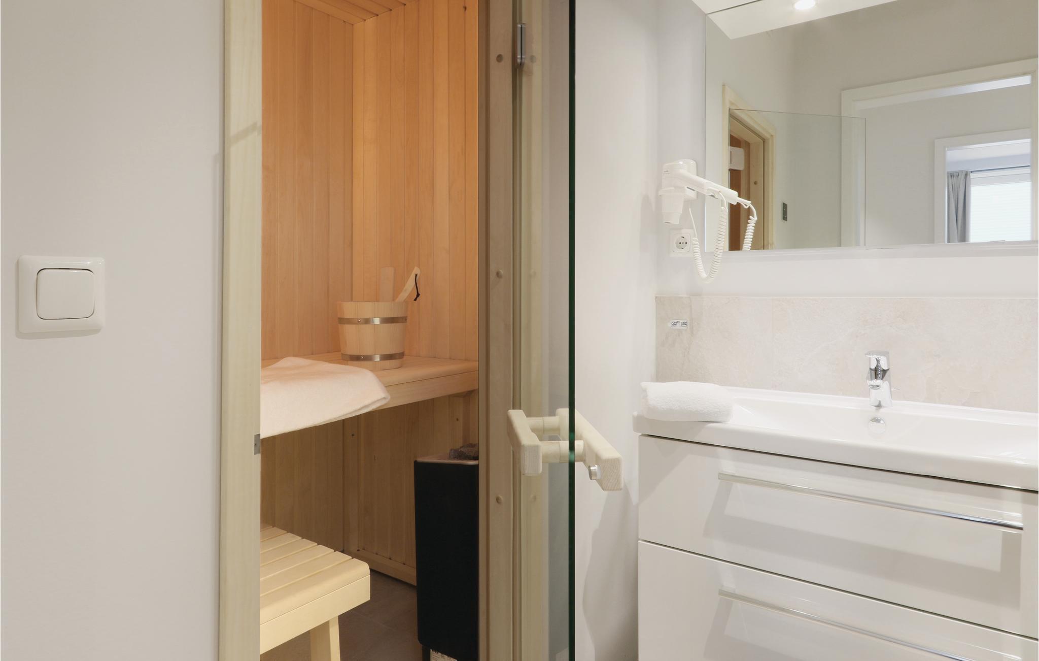 Semesterlägenheten på 1:a våningen har tre sovrum, alla med en platt-TV. För kaffet finns en filterkaffemaskin, ett handfilter eller en Nespressomaskin (ta med egna kapslar). Ditt personliga wellnessområde består av ett badrum med dubbel regndusch, ångbad och bubbelbadkar. I det andra badrummet kan du koppla av i bastun.